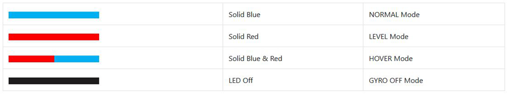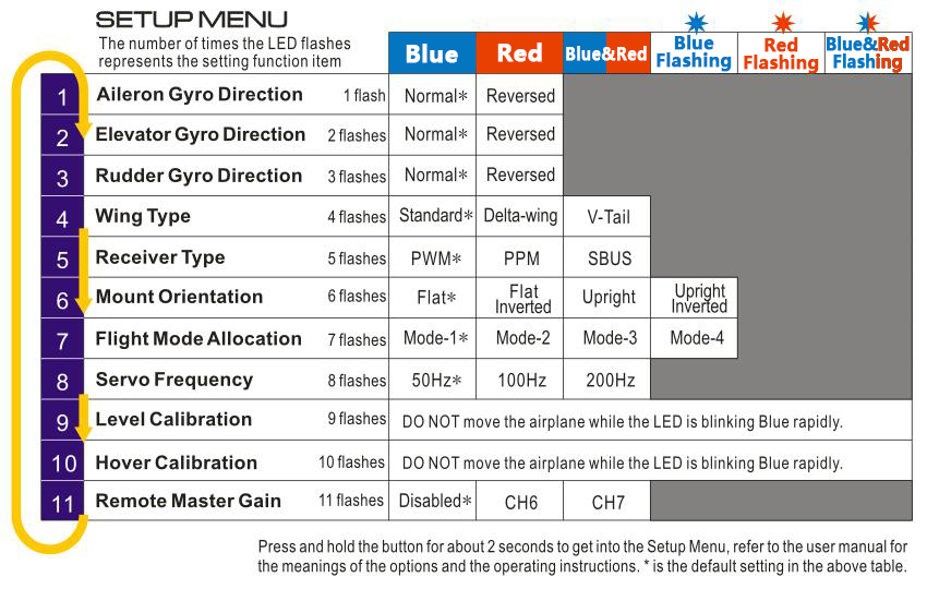 In the Setup Menu, the LED will flash Blue and Red several times every 3 seconds in a loop and the number of times LED flashes shows at which function item you are currently. For example, one Blue and Red flashing means the first setting "Aileron Gyro Direction", after waiting about 3 seconds, a twice Blue and Red flashing means the second setting "Elevator Gyro Direction", and so on.