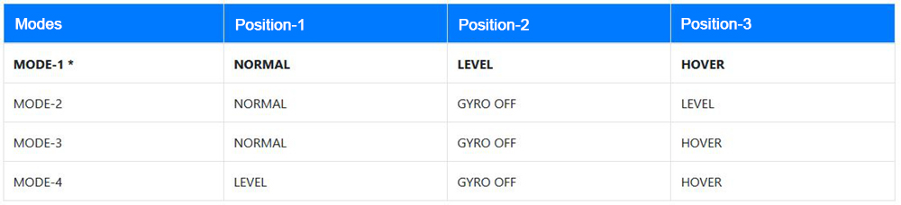 We provide you with 4 different mode allocations corresponding to the 3 positions of the switch in Item 7 of the Setting Menu, the default setting is MODE 1: NORMAL–LEVEL-HOVER.
