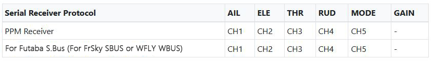 A3 EVO supports PPM and serial receivers for Futaba S.Bus which allows you to connect the gyro to the receiver with one single wire. When using a specific type of these receivers the appropriate type of receiver channel allocation will be preset in the A3 EVO. Please refer to the table below and check if your radio transmits the channels in the correct order. If you use a standard PWM receiver with standard wiring layout the channel mapping does not apply. When A3 EVO is operating in single line receiver mode, the [THR Out/AIL] can be used as the throttle output channel for the ESC or the throttle servo if a mini receiver is being used which has no additional output connectors.