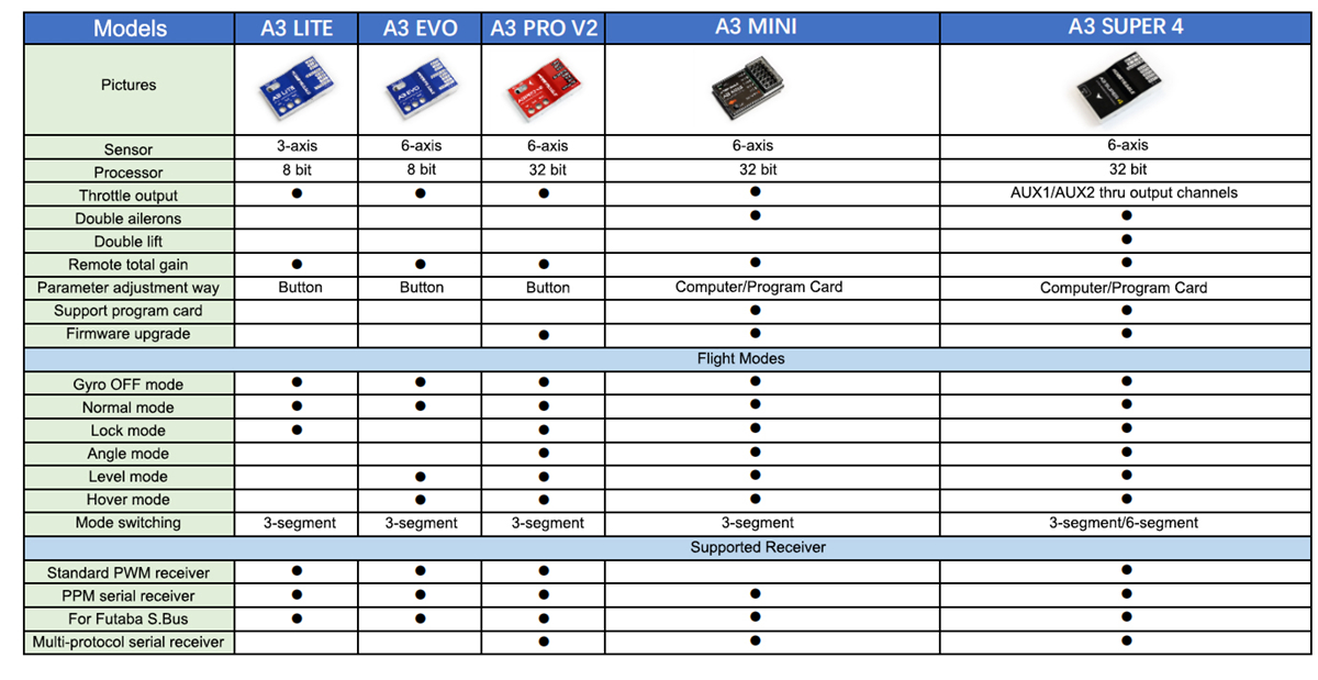 A3 Mini is a high-performance and functional 6-axis mini gyro and stabilizer designed for RC airplanes. The smaller size and more compact design make it more suitable for the small electric airplanes. With the new feature of multi-protocol serial receiver support, it could be compatible with most single line mini receivers on the market.