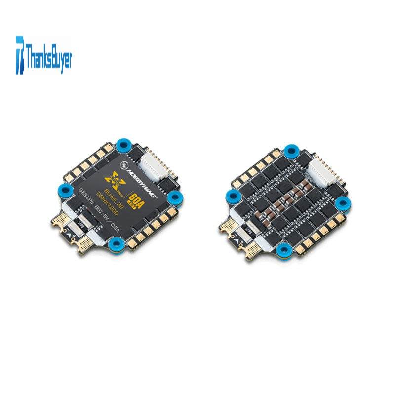 With a similar size of a FC, the 4IN1 ESC includes 4 high performance 60A BLHeli_32DShot1200ESCs, a 5V BEC which can provide power for devices (i.e. FC), and a voltmeter which allows FC to monitor the amp & volt in real time. Two ways for connecting the ESC to a FC: 1) Connecting via soft cables. 2) Soldering via solder tabs are provided for selection. And the shock-absorbing design of mounting holes effectively reduces the external vibration's impact on high-sensitivity components and provides great shock-absorbing protection to upper devices (i.e. FC) . This ESC is designed for FPV racing.