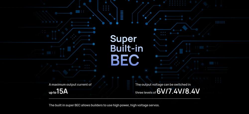 - BEC output: 6V/7.4V/8.4V adjustable, continuous current 6A (switch-mode)