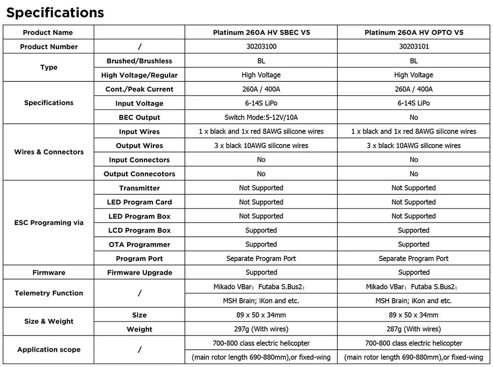 - HOBBYWING Platinum 260A SBEC/OPTO HV V5 ESC with heat sink, cooling design contribute to enhancing the cooling performance of ESCs and prolonging the service life. Better performance, better flying experience, you will get the smoothest flight experience you never had before.