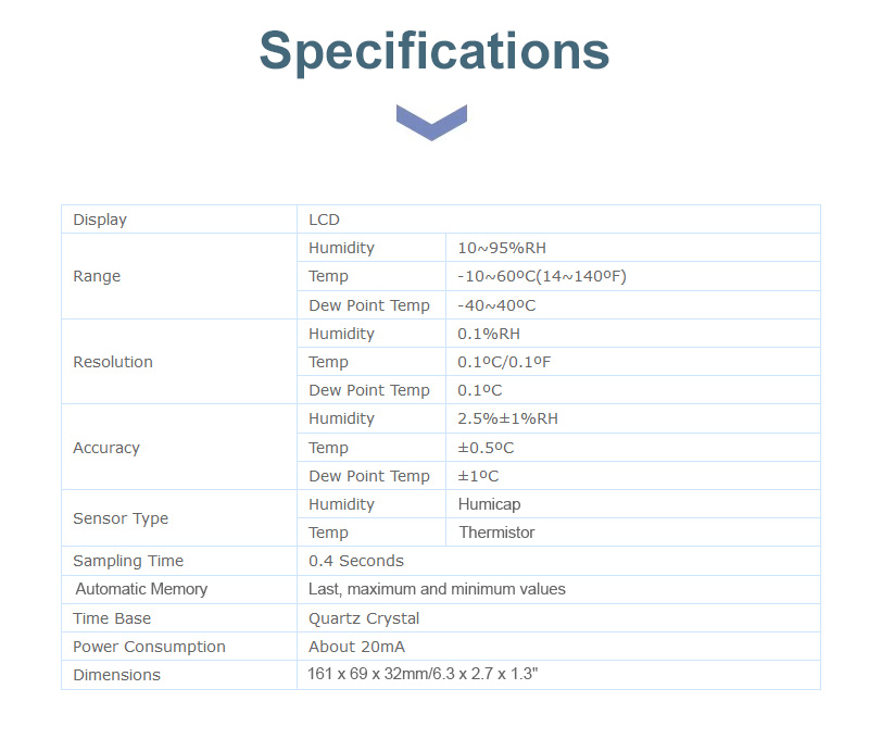 - The last, maximum and minimum values of humidity and temperature will be automatically stored in memory and can be displayed by turn.