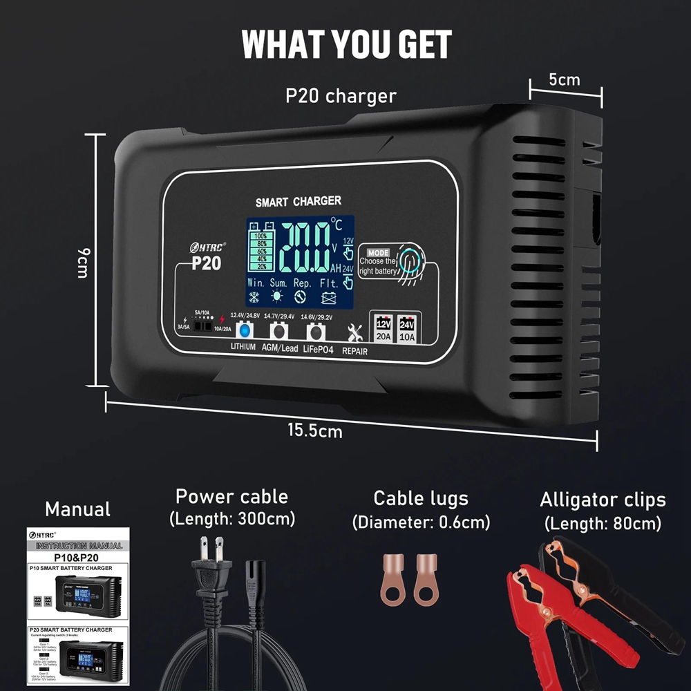 HTRC 20A Storage Battery Charger 12V/24V LiFePO4 Lithium Motorcycle Battery Charger 3 Levels Adjustable Current