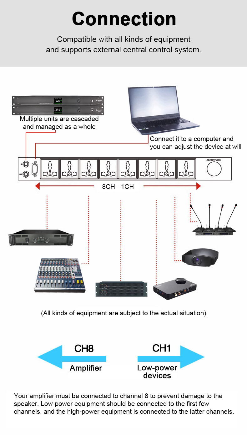 - Compatible with all kinds of equipment and supports external central control system. Your amplifier must be connected to channel 8 to prevent damage to the speaker. Low-power equipment should be connected to the first few channels, and the high-power equipment is connected to the latter channels