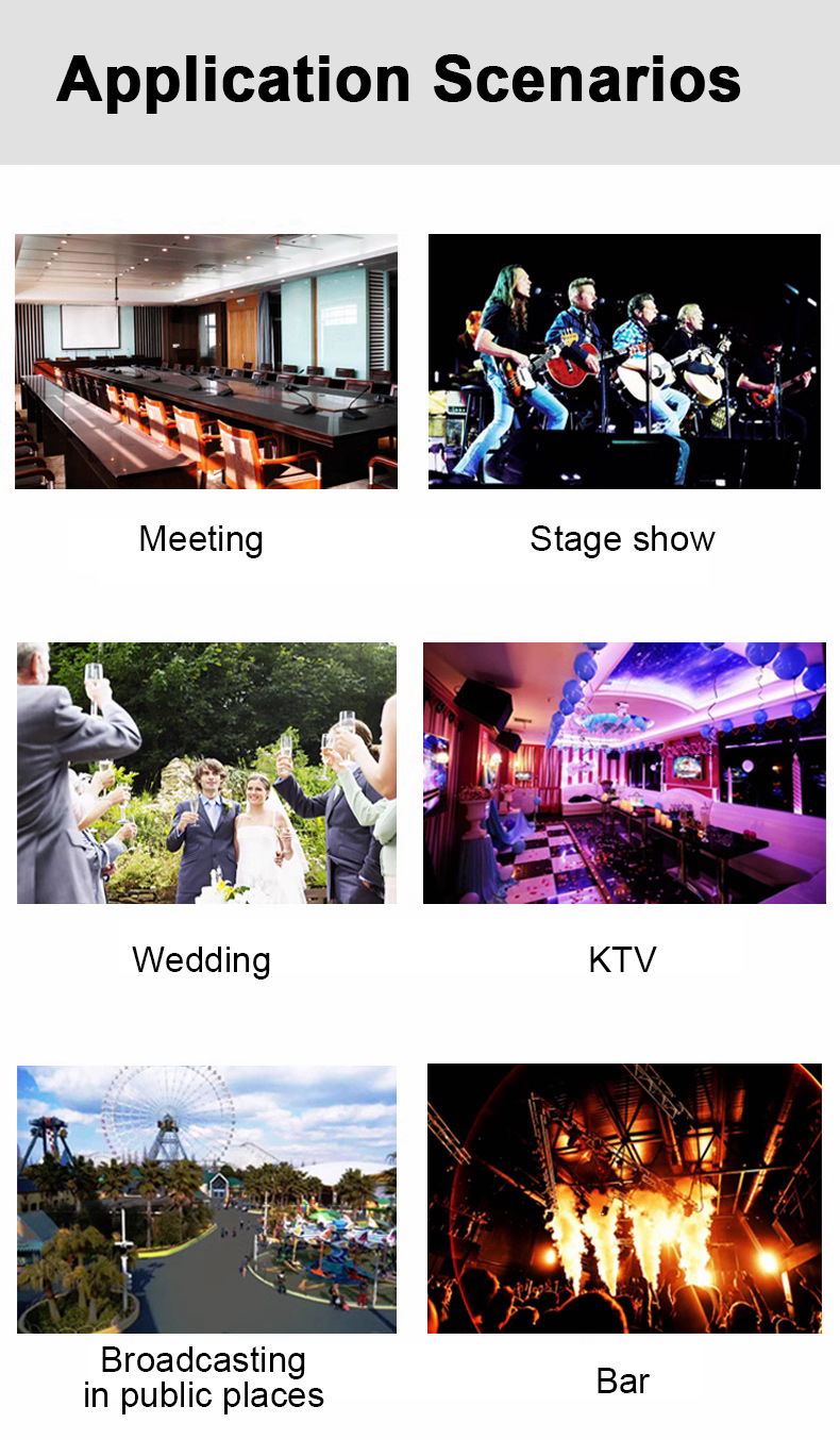 - Widely used: for meetings, stage shows, weddings, KTV, broadcasting in public places, bars, etc.