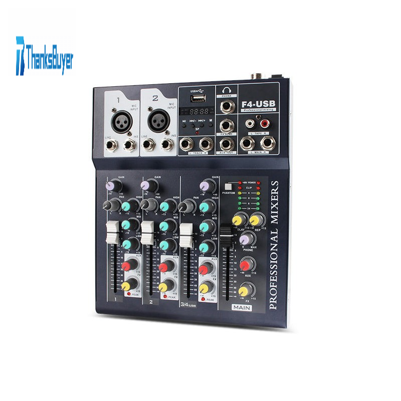 JIY F4 Sound Mixer with USB Professional 4 Channel Audio Mixer Amplifier DJ Mixing Console with Digital Microphone for Home Karaoke