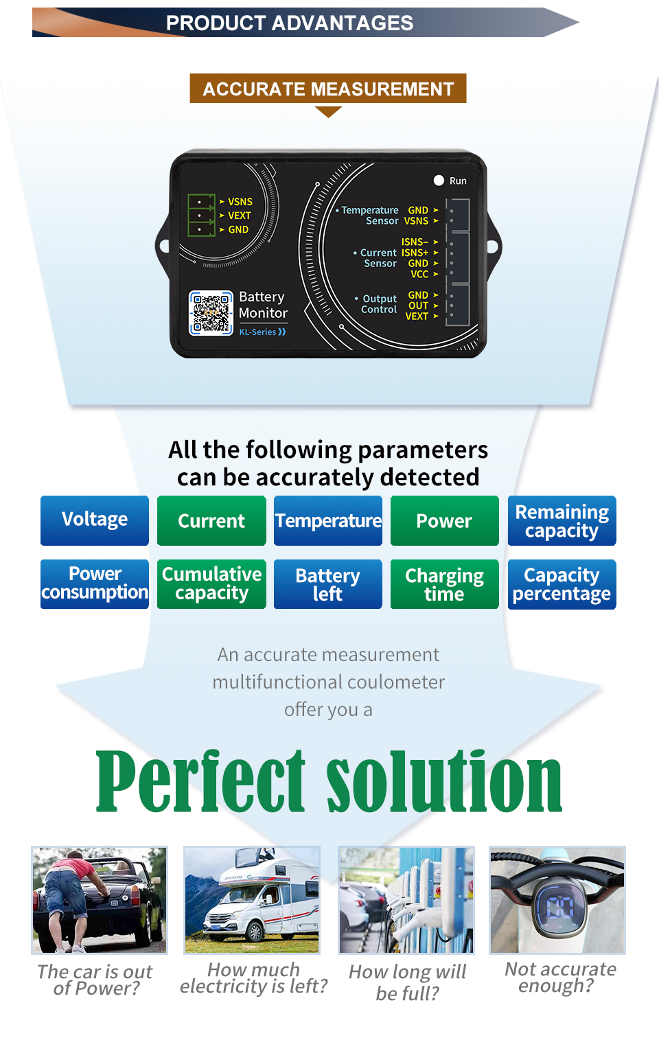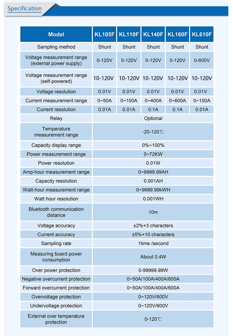The KL-F series volt-ampere meter is a new type of coulomb meter that can measure various physical parameters such as voltage, current, power, charge and discharge capacity, watt-hours, and time. At the same time, it can also set parameters to achieve multiple protections, including over-voltage, under-voltage, over-current protection, over-power, and over-temperature protection. The meter can automatically identify the direction of the current, monitor battery capacity in real time, view the measured data through Bluetooth, and control the meter and firmware upgrade through mobile phone APP.