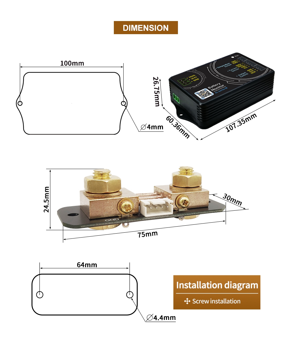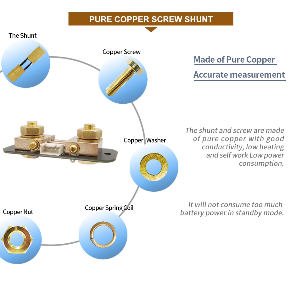 - The shunt and screws are made of pure copper material, which has good electrical conductivity, low heat generation, and low power consumption. In the standby state, it will not consume too much battery power.