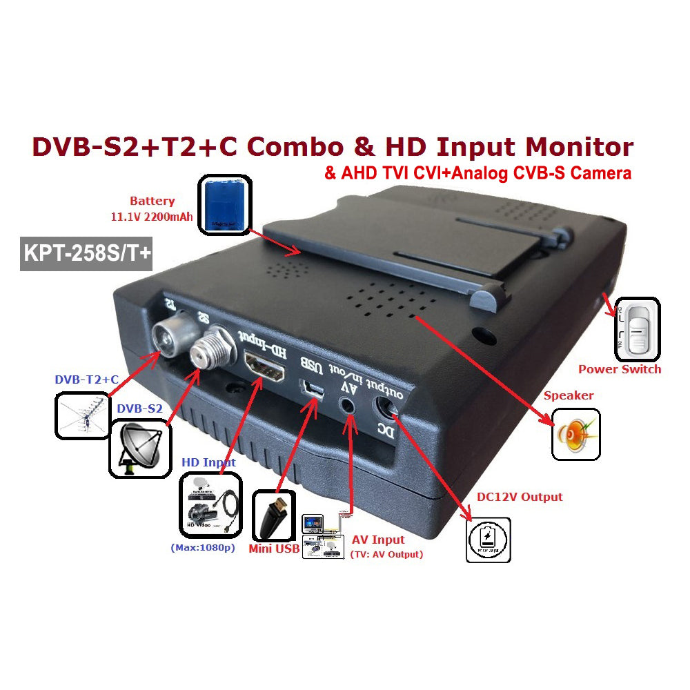 KPT-258S/T+ Satellite Finder HD Monitor CCTV Camera Tester AHD Input (S2 + T2 + C Combo + HD + AV)