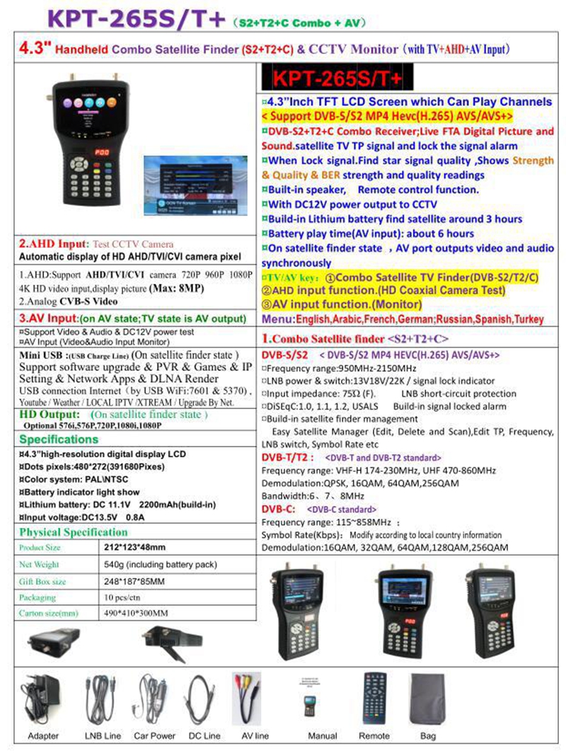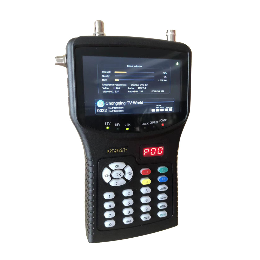 KPT-265ST + DVB-T2 DVB-C Satellite Finder Meter with TFT LCD Screen DC 12V HD 1080P