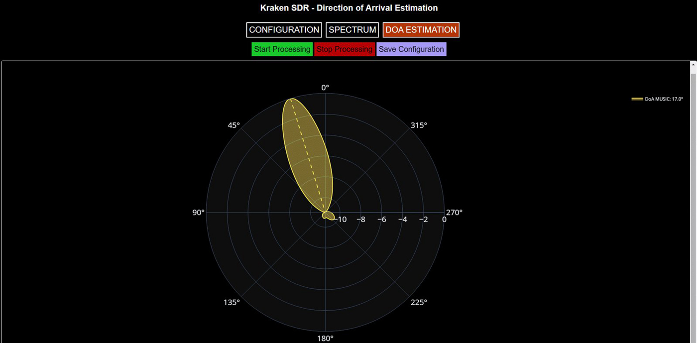 The new KrakenSDR software comes with an easy-to-use web interface for setting up a direction finding system. With this interface it is possible to set the frequency, gains, and other advanced settings related to the DAQ code. You can also monitor the live-spectrum view and graphs of output from the direction-finding algorithm.