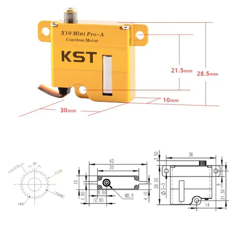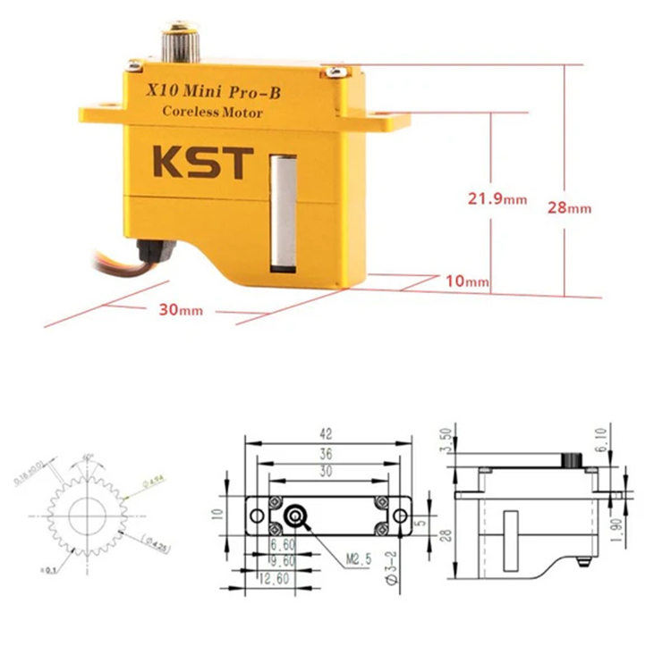 Compared to the regular X10 Mini servo, it has a higher torque, faster speed with a larger travel angle. X10 Mini Pro servo has an outstanding 8.0Kgf.cm torque and an amazing 0.08sec speed.