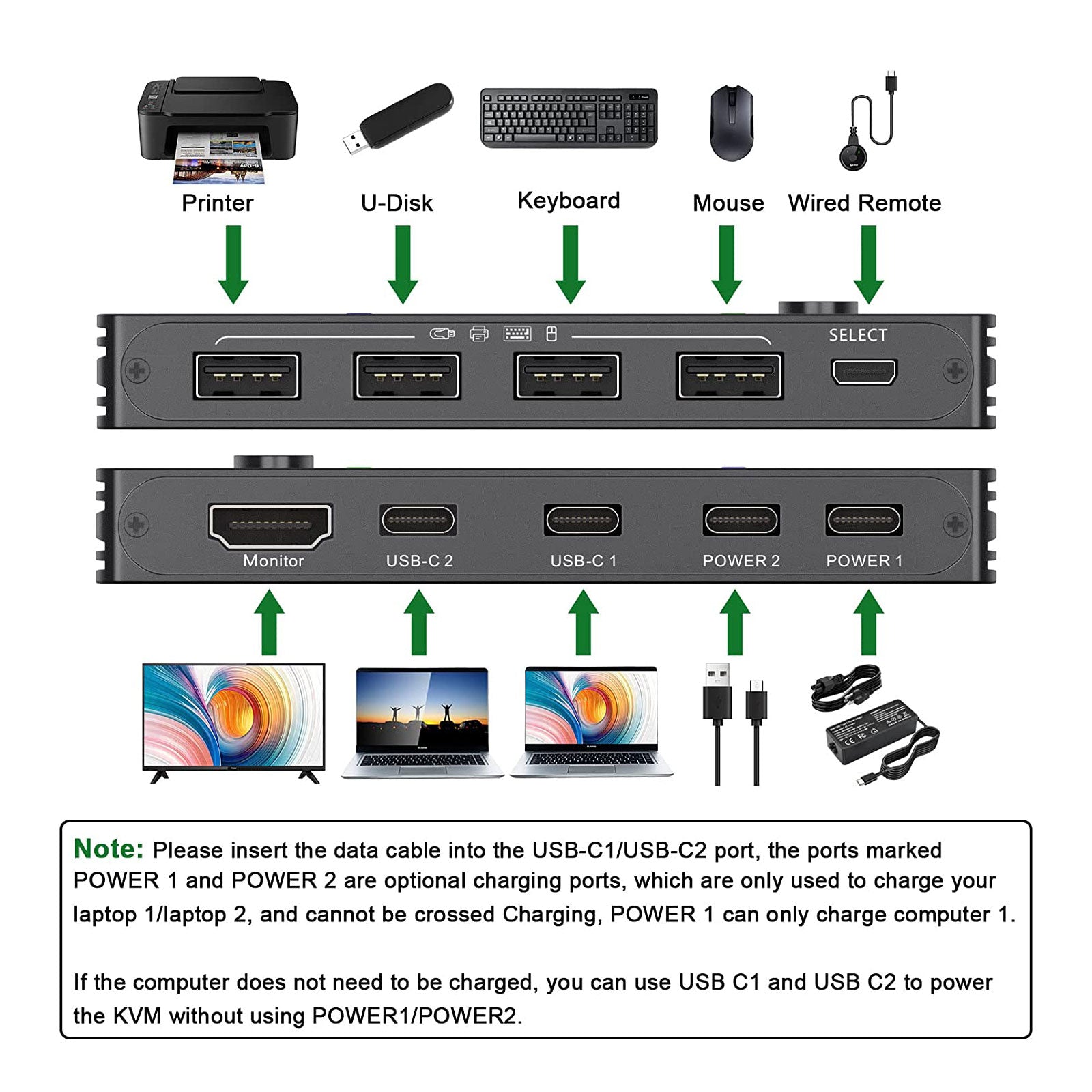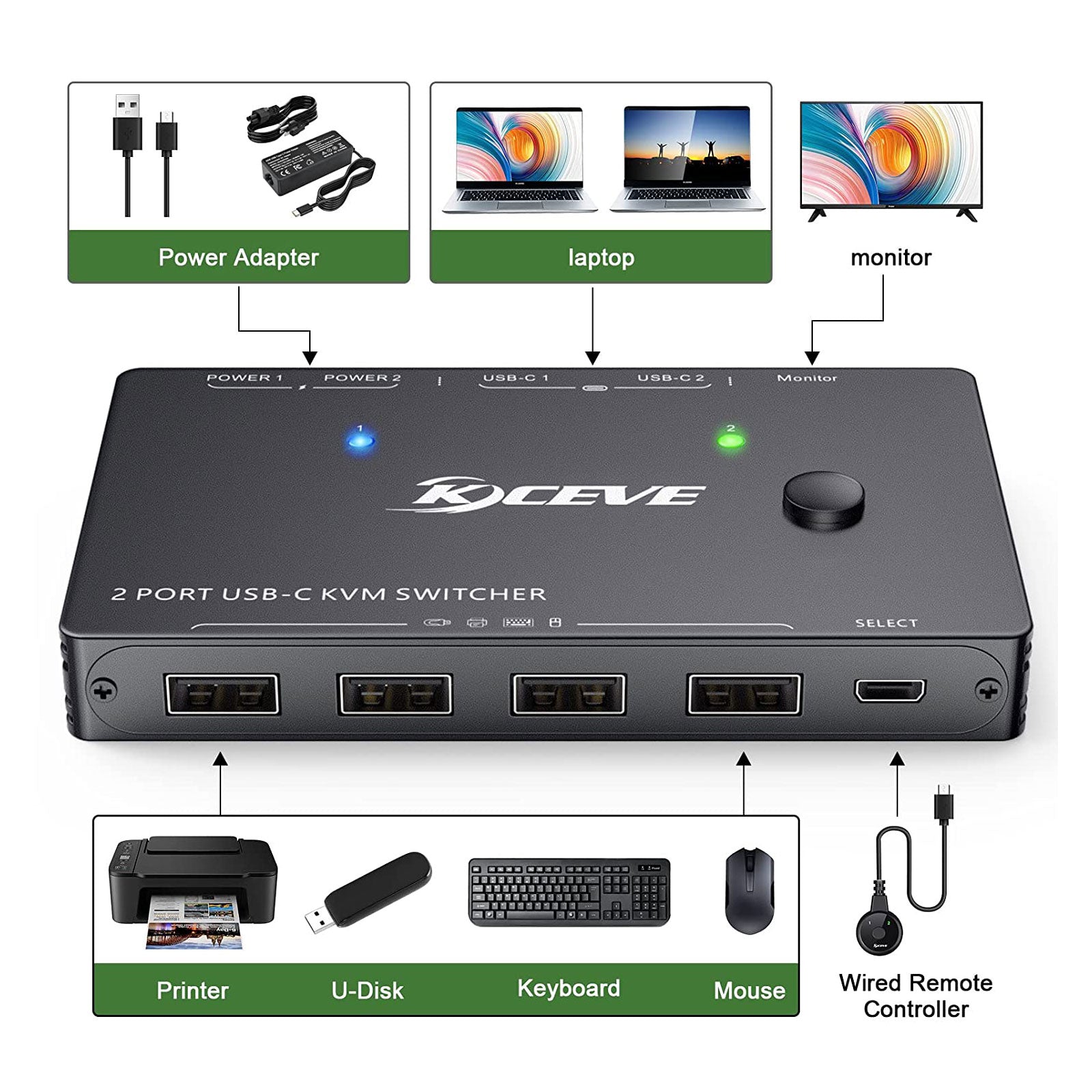 KVM201TCC 4K 60Hz KVM Switch 2 Port USB-C KVM Switch Supports Laptop PC Monitor Keyboard Mouse