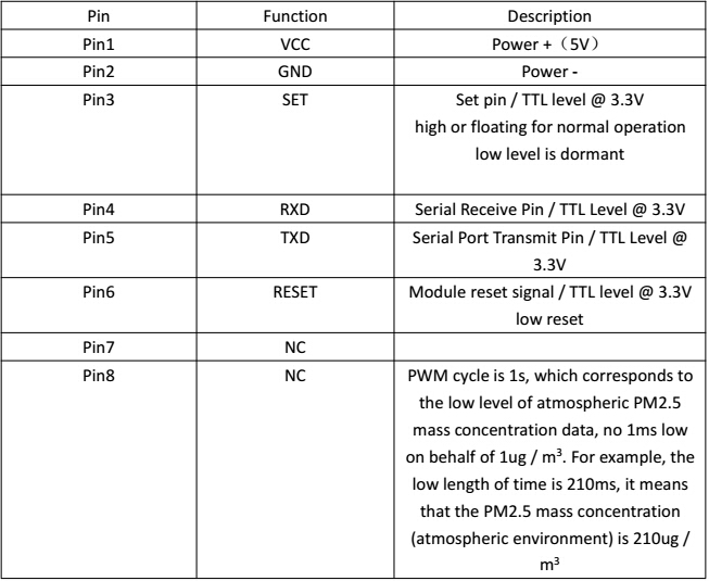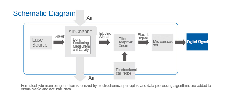 This sensor uses the principle of laser scattering. The laser is irradiated on the suspended particles in the air to produce scattering, and at the same time, the scattered light is collected at a certain angle to obtain the curve of the scattered light intensity with time. Furthermore, the microprocessor uses an algorithm based on the MIE theory to obtain the equivalent particle size of the particles and the number of particles of different sizes per unit volume.