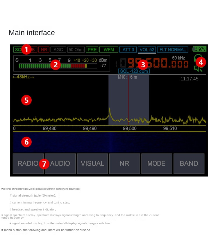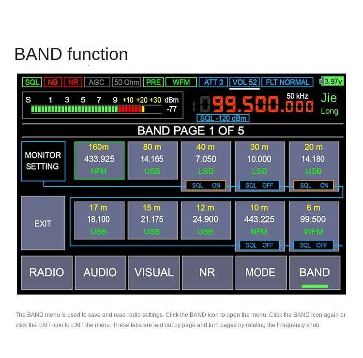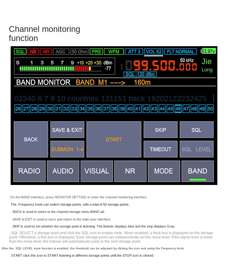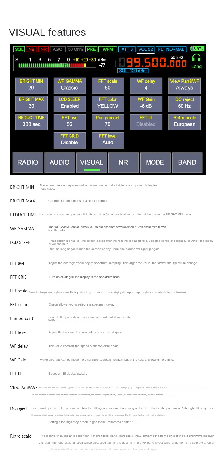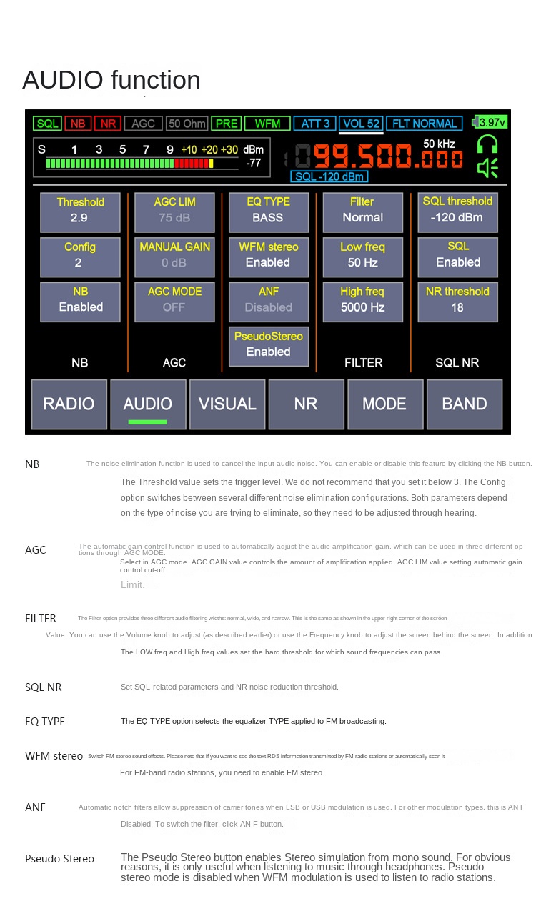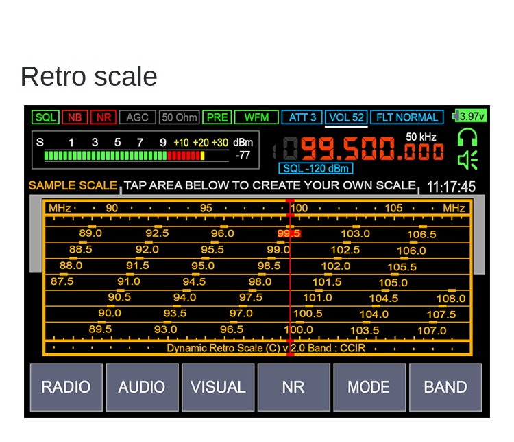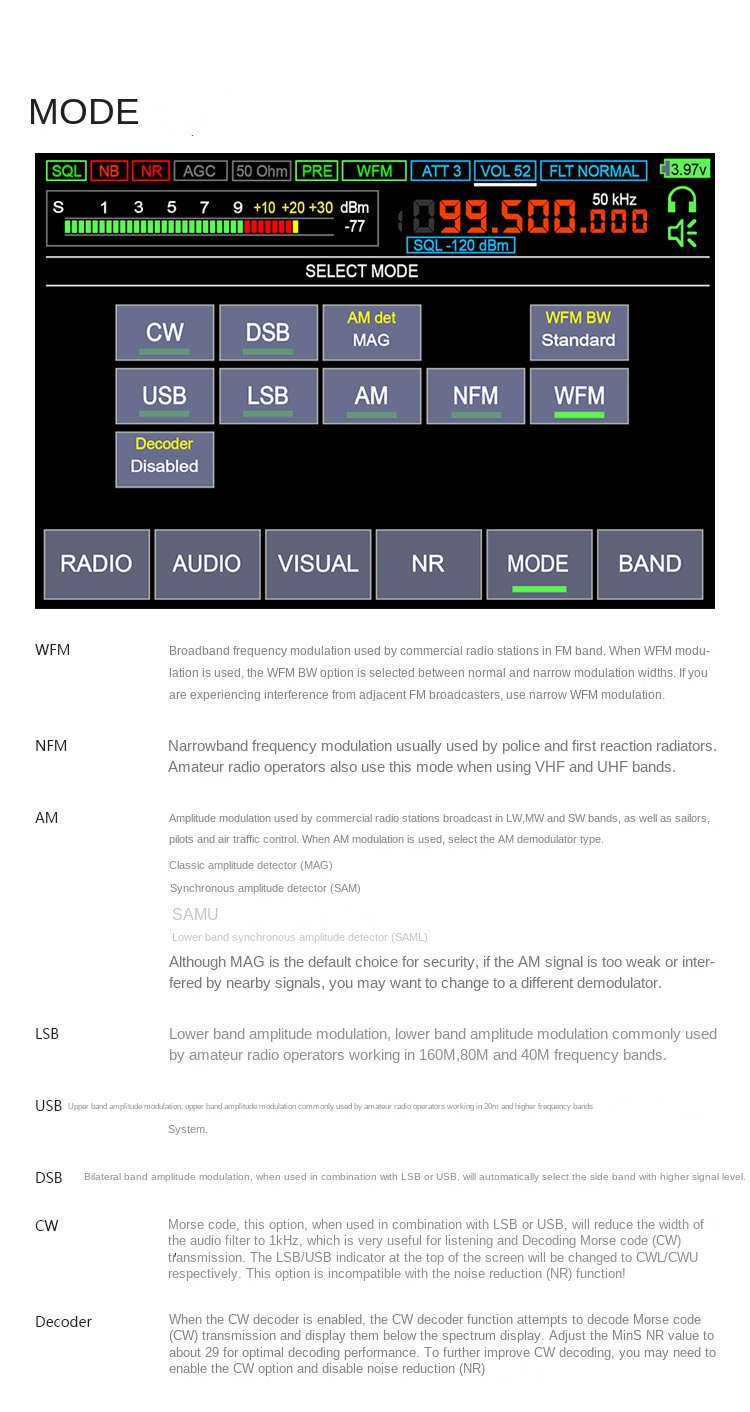 - Modulation type: AM, SSB, DSB, CW, NFM, WFM