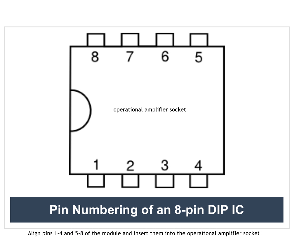 - This module has a direction, and pins 1-8 are marked on the circuit board. Pin 1 is marked with a dot and must not be installed upside down during use (Pin 1 should face the first hole in the bottom left corner of the op amp socket gap). We are not responsible for any damage to other devices caused by reverse insertion.