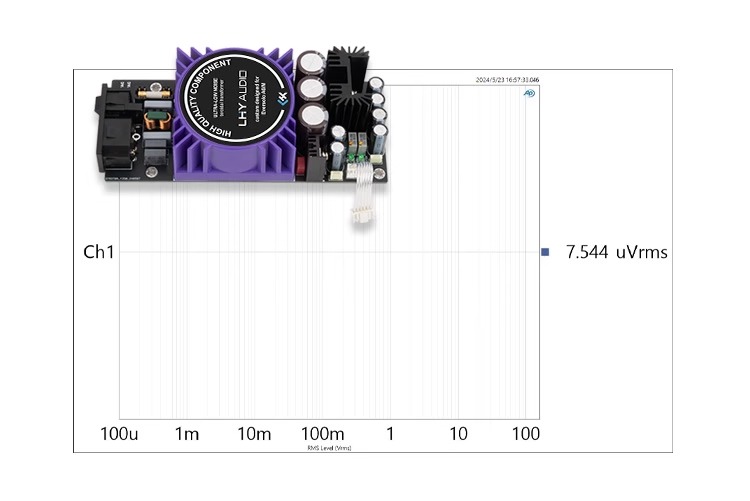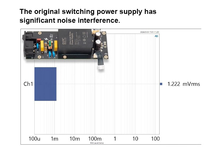* In practical measurements, the LPS-A6 Linear Power Supply shows a ripple of 7.544uV at full load, while the original power supply exhibits a ripple of 1.222mV (1222uV). The full-load linear power supply produces over 100 times less ripple noise compared to the no-load original switch-mode power supply.