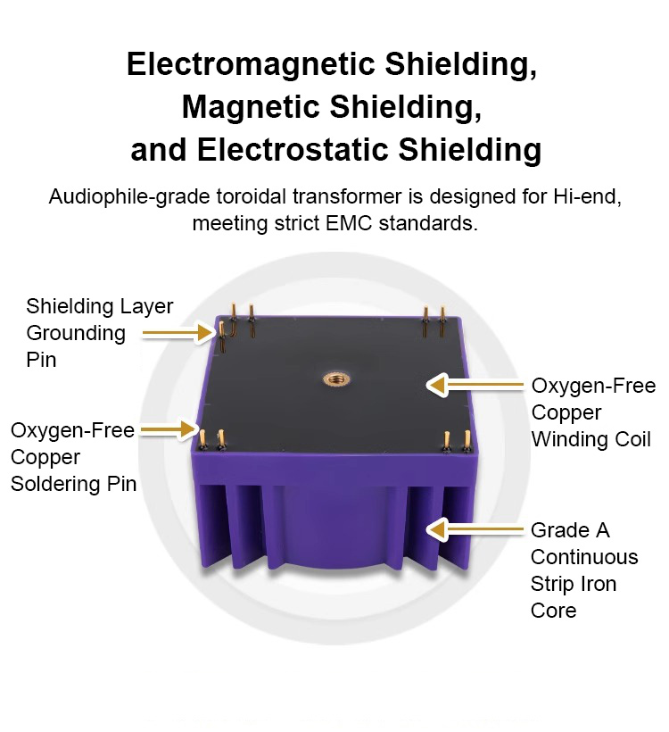 * A high-permeability, low-iron-loss premium toroidal core, high-quality oxygen-free copper windings, along with epoxy encapsulation and pin design, ensure power stability, operational efficiency, and exceptional voltage regulation. This delivers an audiophile-grade experience with fidelity—pure dynamics and excellence.