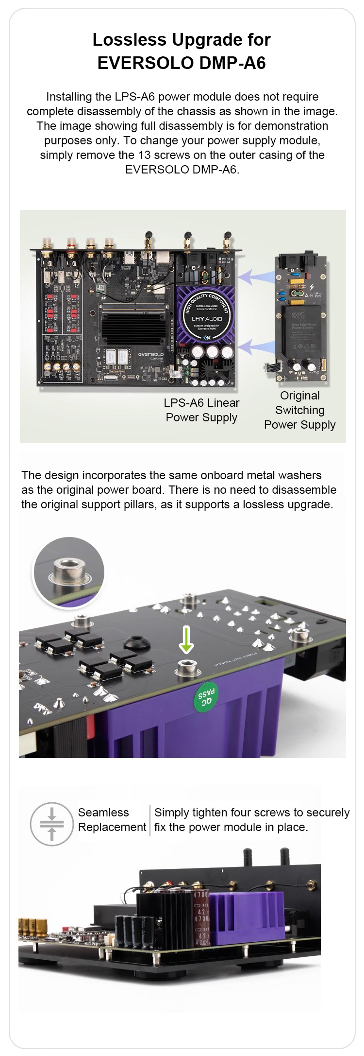 This is a linear power supply upgrade module specifically designed for Eversolo DMP-A6. Customers can easily DIY the upgrade themselves. It completely and seamlessly replaces the original switch-mode power supply (SMPS) module, allowing you to enjoy a significant upgrade without any loss. Experience the joy of a big upgrade at a small cost with ease!