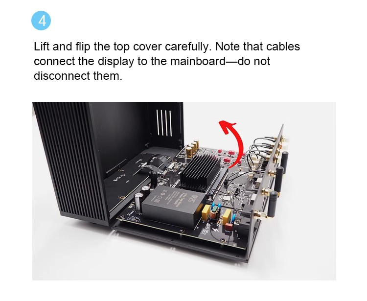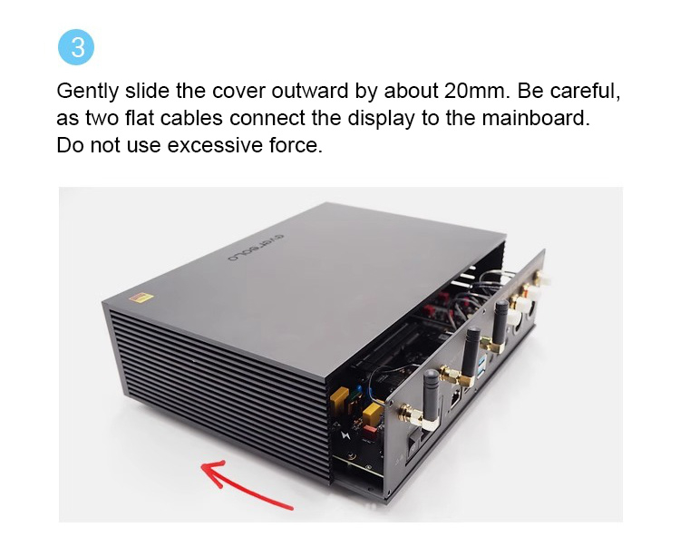 2. When disassembling the device, pay special attention to the two ribbon cables connected to the display. Once the chassis is opened, make sure to secure the cover properly to prevent it from tipping over and damaging the display cables. If you are unsure, please consult customer service.