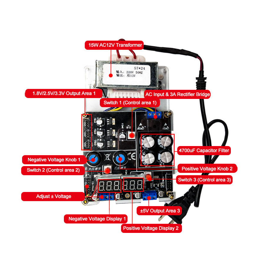 This module uses a 3m and a 5mm acrylic board to fix the power supply for protection. The module structure is more compact, more durable, and its service life is extended. Equipped with a 3-digit digital tube voltage display, it is more convenient to read. The module can be divided into 8V/2.5V/3.3V low voltage output area, positive and negative ADJ adjustable voltage area (positive voltage: +1.25V to +15V range adjustable, negative voltage: -1.25V to -15V range adjustable) , ±5V output area, the highest output current is 1A, the output current is determined by the load.