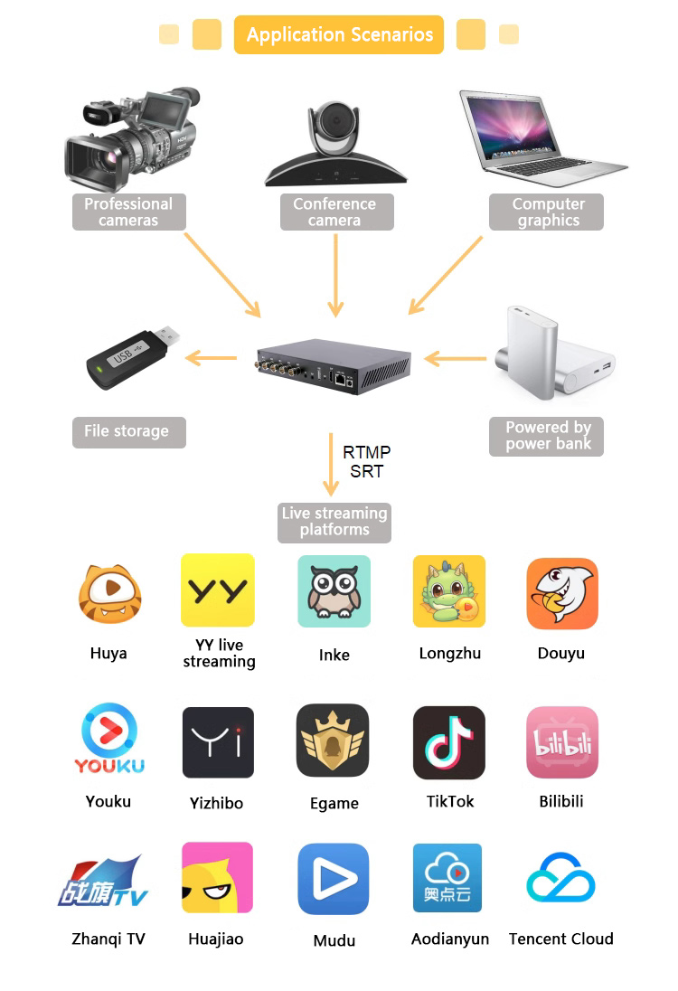- Multi-platform live streaming: Only one encoder is required to push live streams to any number of platforms at the same time