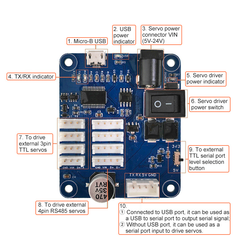 9. A TTL level selector switch serves to select the external serial communication device connected to the 10th port. If logic '1' corresponds to a level of 3V3, turn the level selector switch to 3V3. If logic '1' corresponds to a level of 5V, toggle the level selector switch to 5V. When the USB port is used to drive servos, toggle the level selector switch to the 5V position.