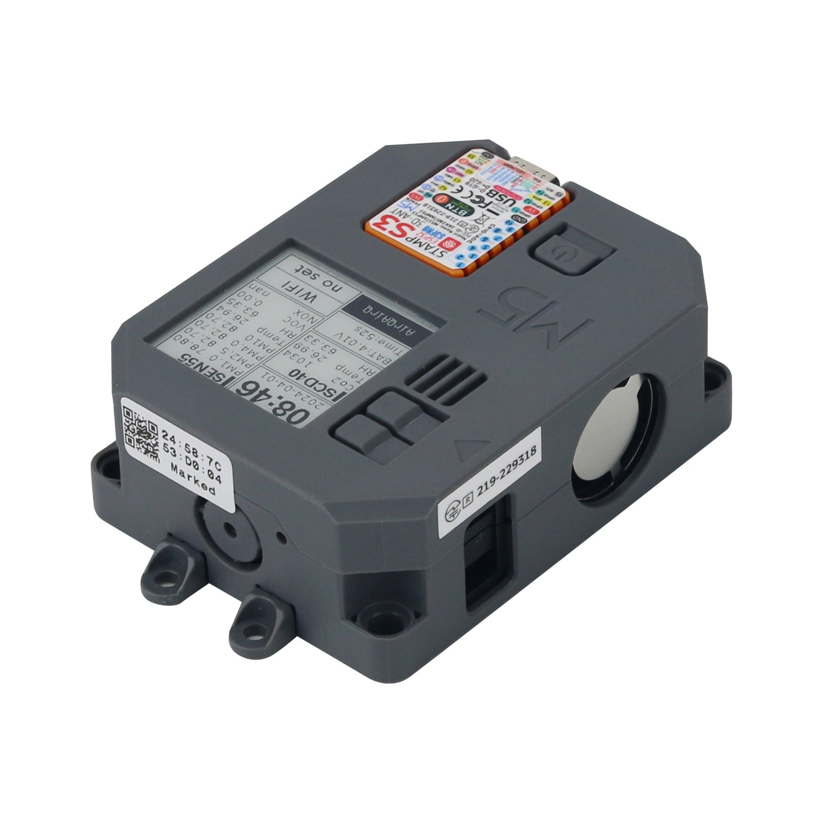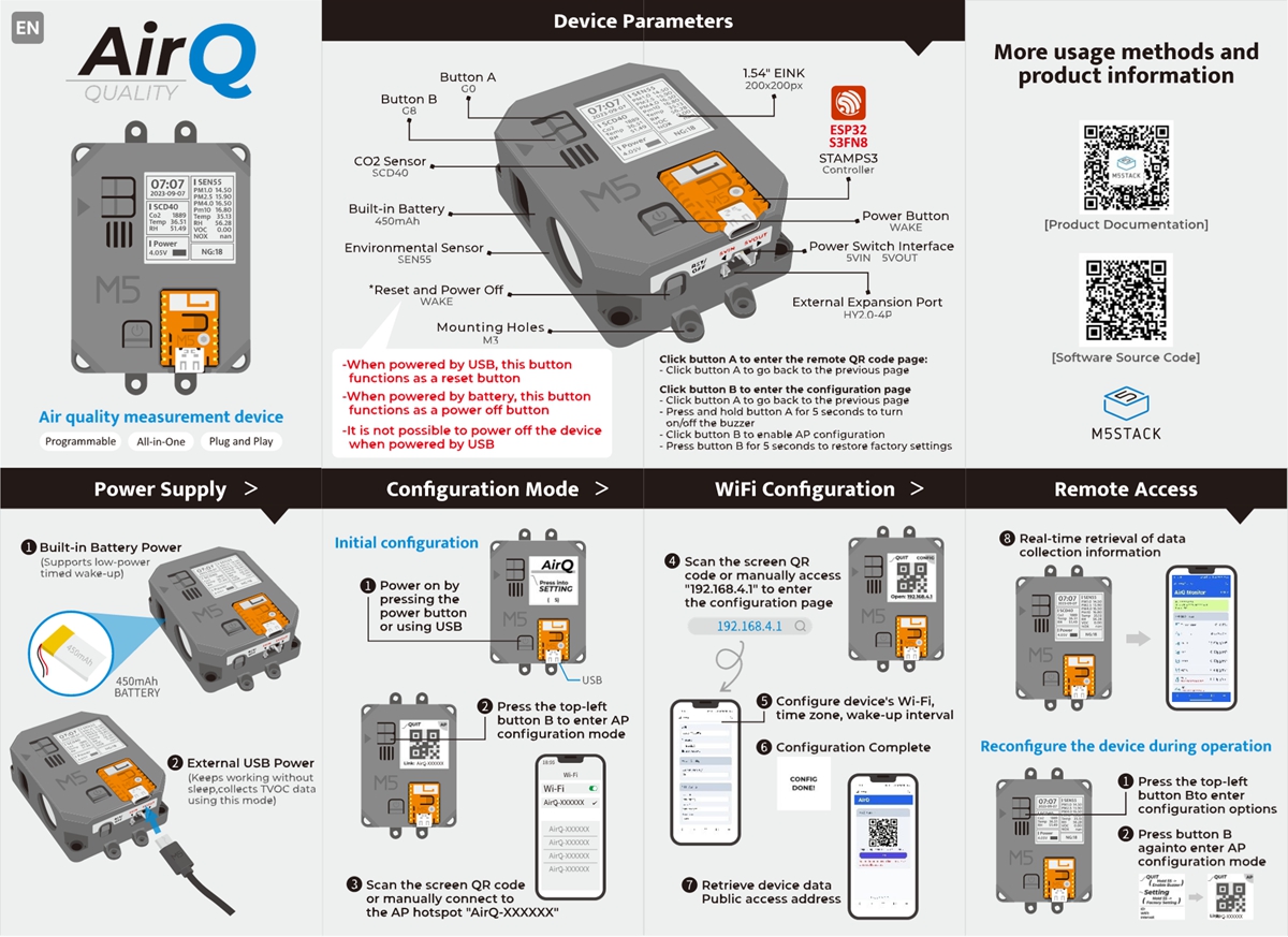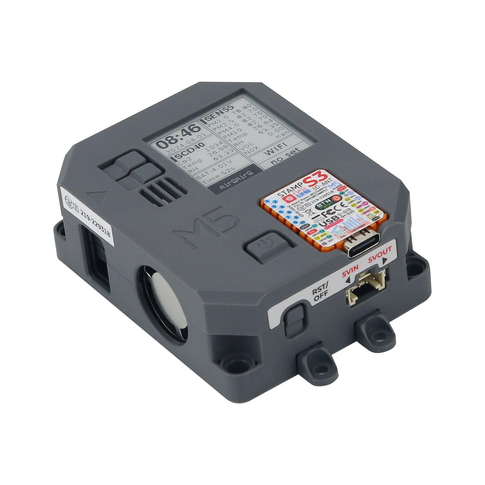 - AirQ is an integrated, low-power air quality monitoring device designed to provide comprehensive air quality monitoring solutions. It features multiple components, including the SEN55 air quality sensor and the SCD40 CO2 sensor, enabling the monitoring of PM1.0, PM2.5, PM4, PM10 particles, temperature, humidity, VOC, and CO2 concentrations. Powered by the StampS3 main controller and equipped with 8M Flash memory, AirQ ensures efficient data processing and storage capabilities.