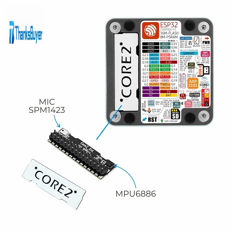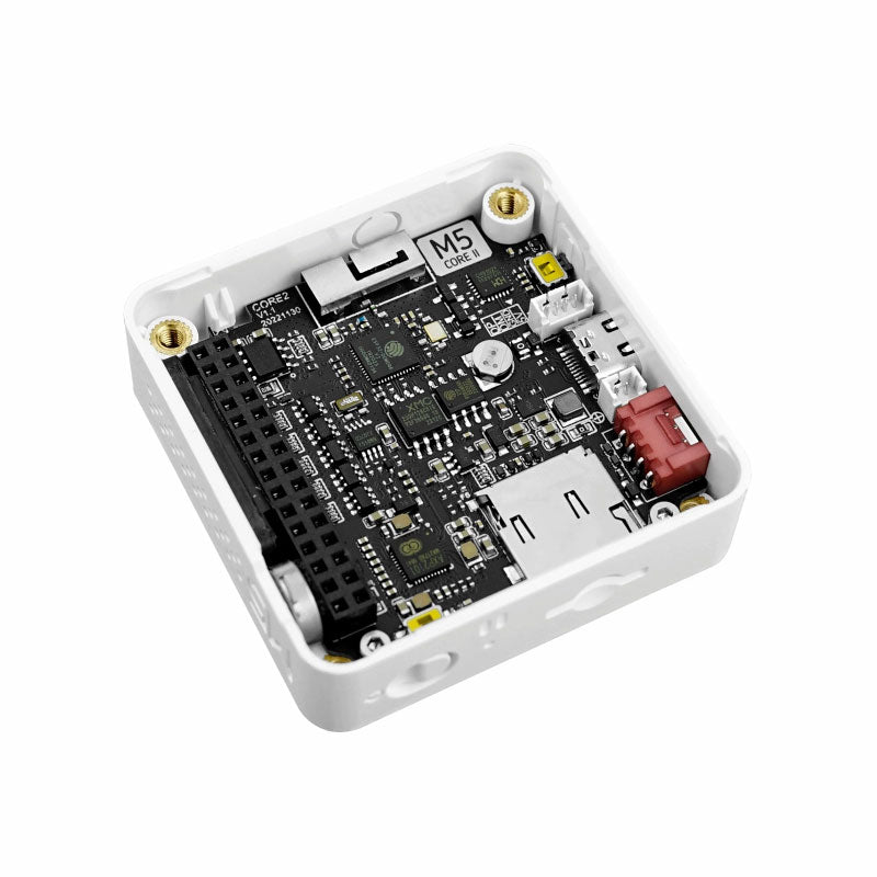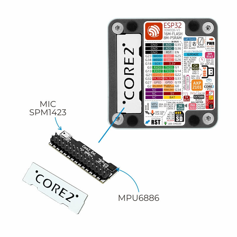 - Core2 V1.1 has an integrated RTC module and a dedicated battery for RTC power supply, providing accurate timing functionality. Furthermore, the AXP2101 power management chip effectively controls the power consumption of the device. Core2 V1.1 also has a built-in blue power indicator light, which can be used to implement specific functions or status indications according to the user's application needs. Core2 V1.1 is also equipped with a Micro SD card slot, speaker, and a high-quality I2S digital audio interface power amplifier chip. The expansion board on the back of the device integrates a 6-axis IMU sensor and a microphone, providing additional functionality and possibilities.