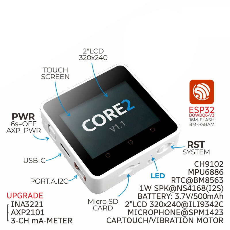 - Core2 V1.1 is an iterative version of Core, with upgraded power IC and a continuation of the classic design of Core2. It is a powerful and user-friendly development board. Core2 V1.1 is equipped with ESP32-D0WDQ6-V3, featuring two independent 32-bit LX6 processors for Xtensa with a clock frequency of up to 240MHz. It supports WiFi functionality and has onboard 16MB Flash and 8MB PSRAM, and supports program downloading via the TYPE-C interface. Its strong configuration can meet the requirements of complex applications.