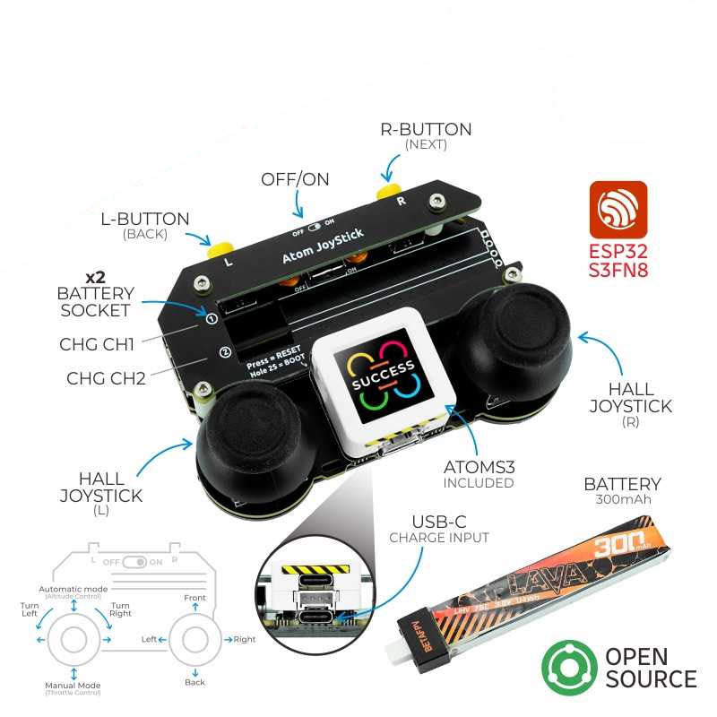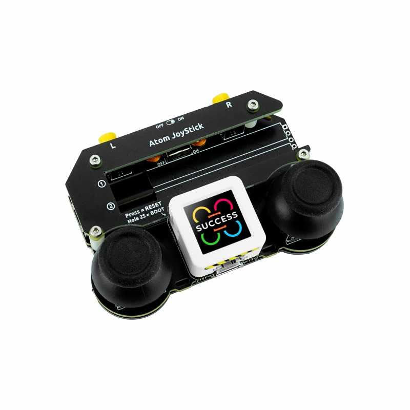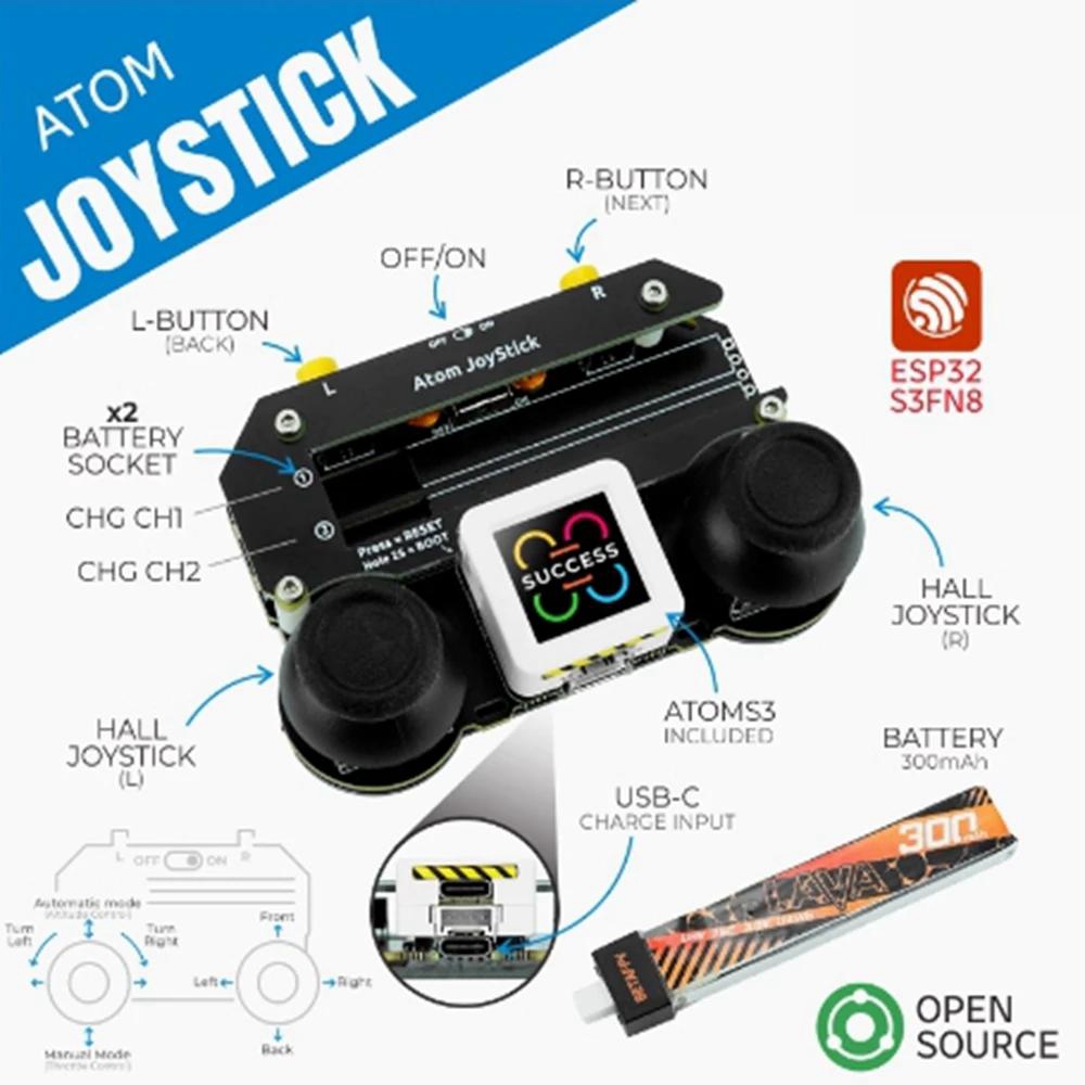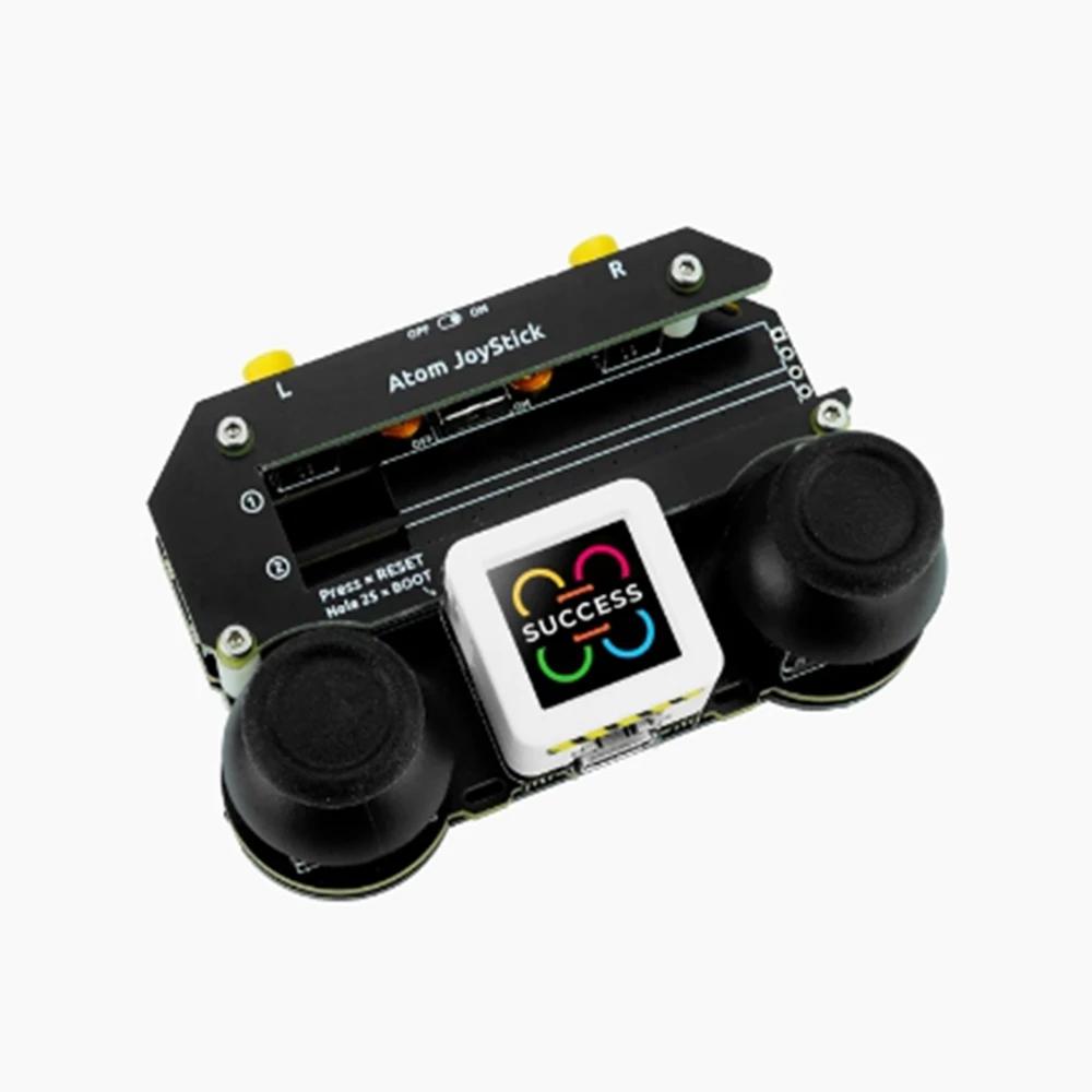 - M5Atom Joystick is a multi-purpose programmable dual joystick remote control that uses AtomS3 as the main controller and Stm32 for co processing on the board. It is equipped with 2 Hall sensors and a 5-direction joystick, as well as 2 function buttons. The built-in RGB light beads are used for human-machine interaction and status reminders; Equipped with two high-voltage power battery charging circuits. Factory pre burned Stamp Fly remote control firmware, communicates with Stamp Fly through ESP-NOW protocol, and the firmware source code is open source. This product is suitable for drone control, robot control, smart cars, and various DIY projects.