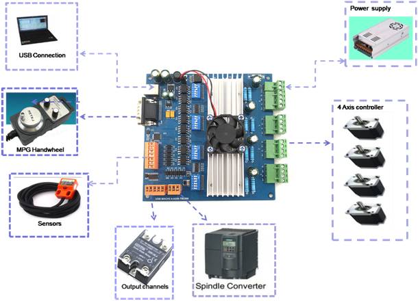 1. Support for 4-axis linkage, you can connect four stepper motor drives or servo drives;
