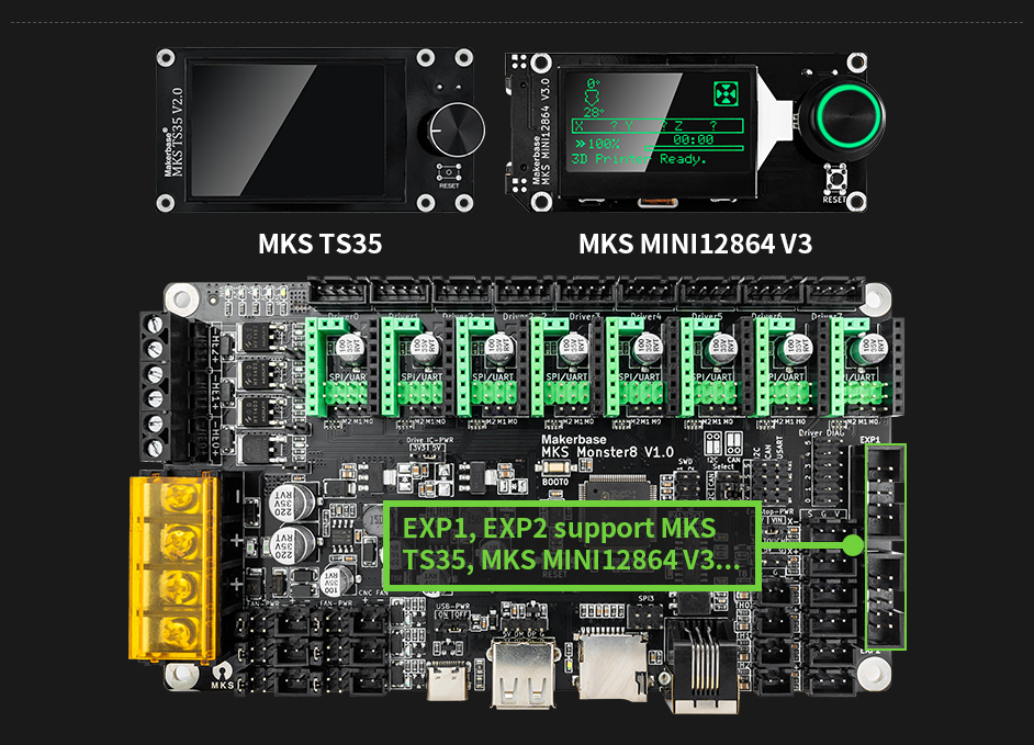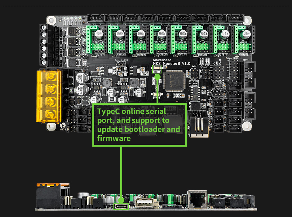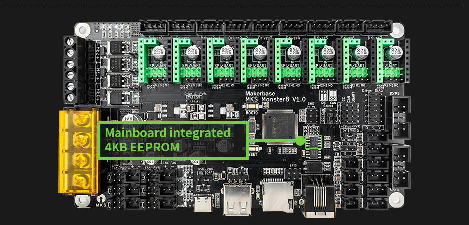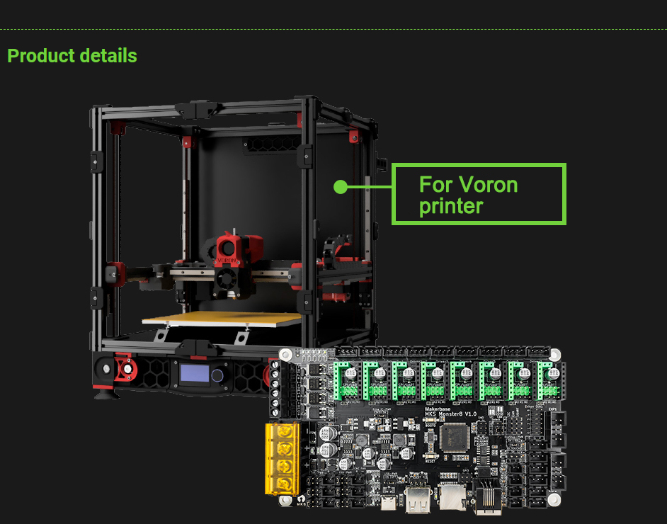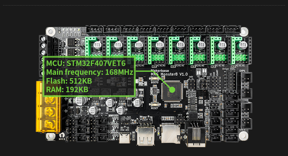 MKS Monster8 is an 8-axis motherboard. It can be used for Voron. Its firmware supports for Marlin 2.0.x and Klipper. LCD monitors such as MKS TS35 and MKS MINI12864 are supported. It also supports U disk printing. Set DFU mode via Boot0 button.