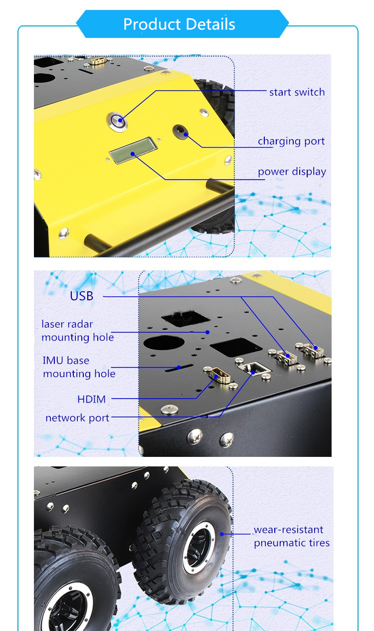 Pre-installed devices: pre-installed start switch, power indicator, charging port on the oblique side of the car body, pre-installed 2-USB interface, network port interface, HDMI interface on the top plate