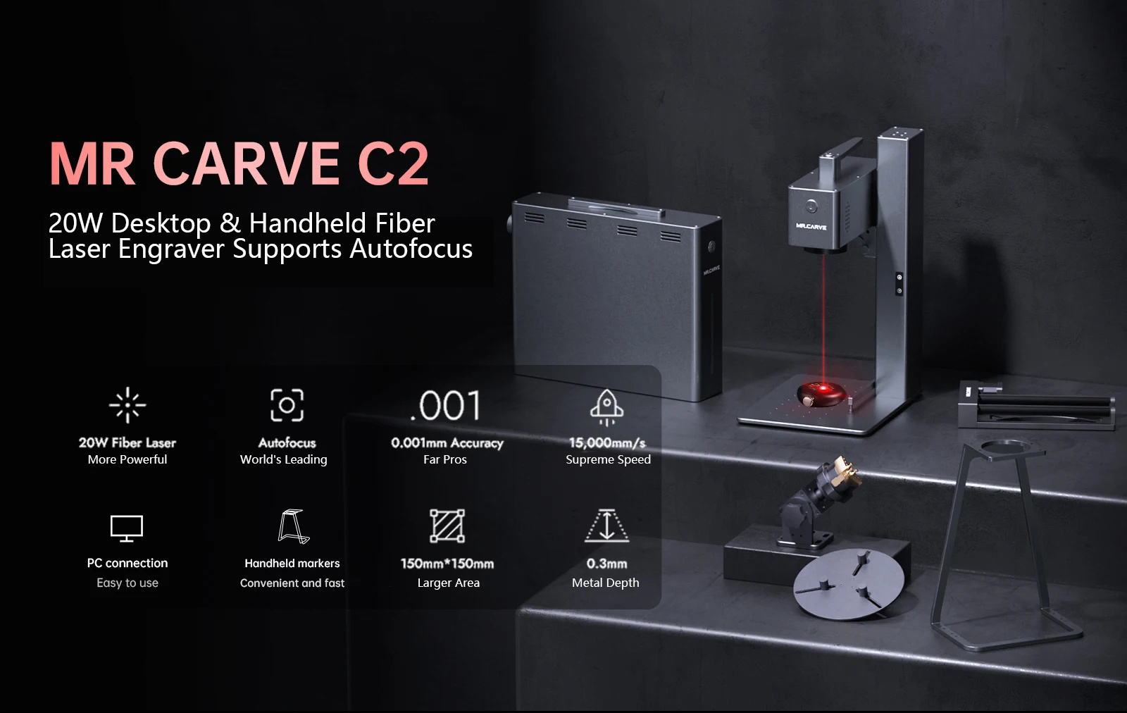 - Desktop & Handheld Laser Engraver: C2, the most portable 20W industrial laser marking machine, weighs only 10kg. It can be used for desktop assembly line. It can also be handheld for immovable objects on the wall for laser marking.
