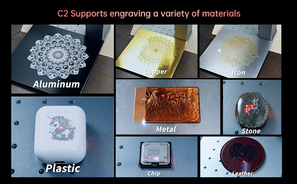 - Suitable for DIY Enthusiasts: Bring your handmade ideas to life in the blink of an eye. C2 engraves photos and designs on metal, jewelry, plastic molds, metal credit cards, and deep engraving of commemorative coins. Ideal for beginner laser enthusiasts with a passion for creativity. The machine comes pre-assembled and it is easy to use. Easy to operate and powerful.
