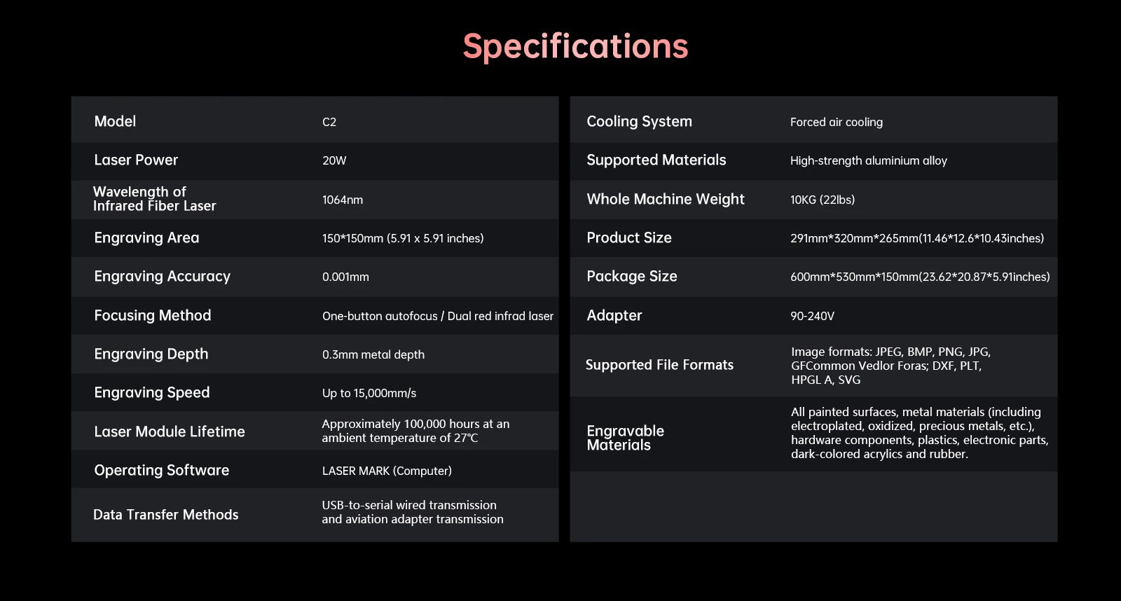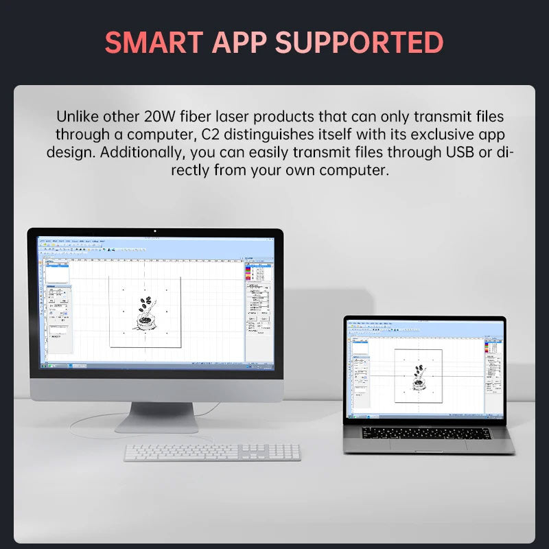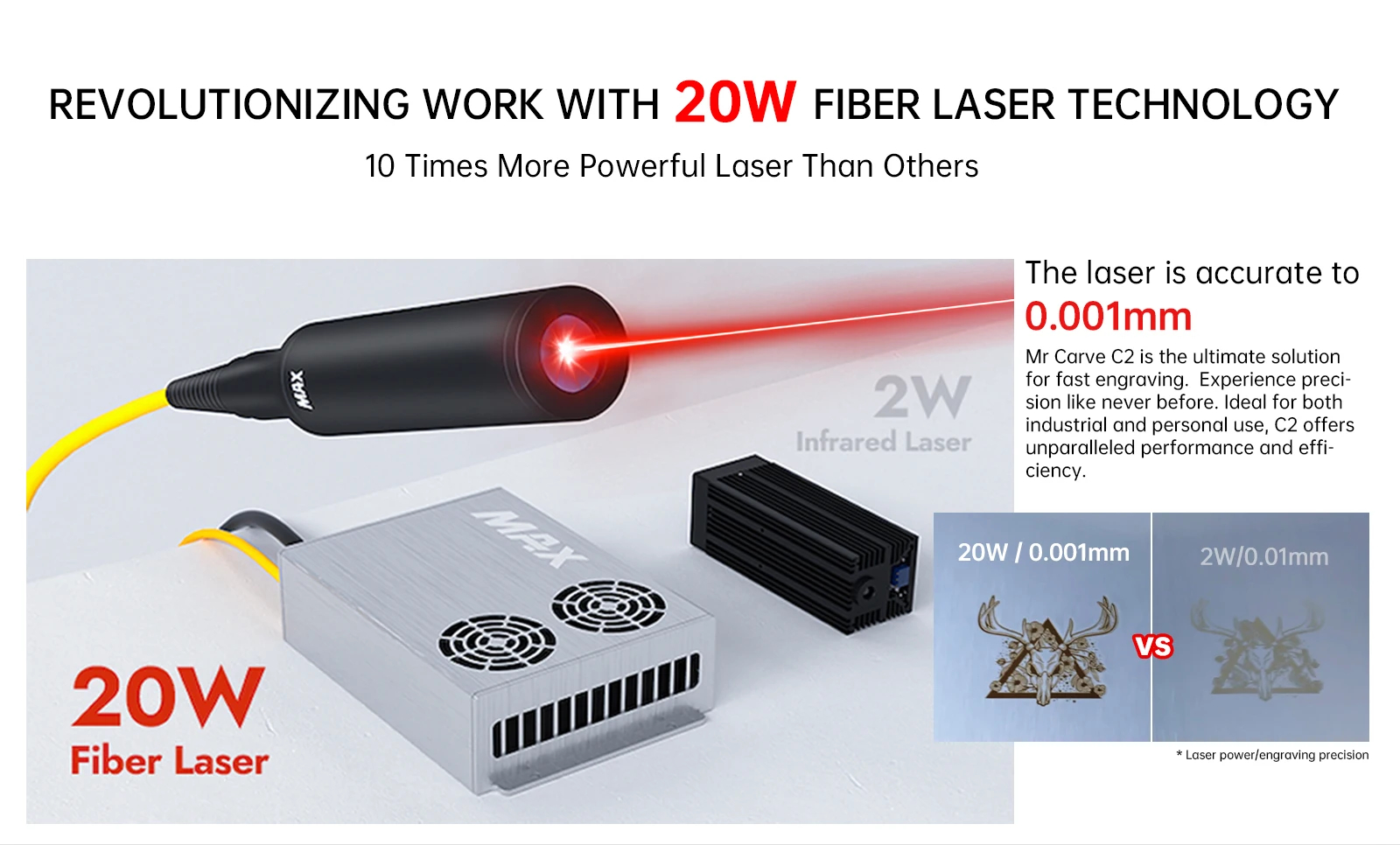 - 20W High Power: In contrast to the 2W end pump, the C2 uses a 20W fiber laser. This allows you to produce accurate designs more efficiently than with other marking machines.