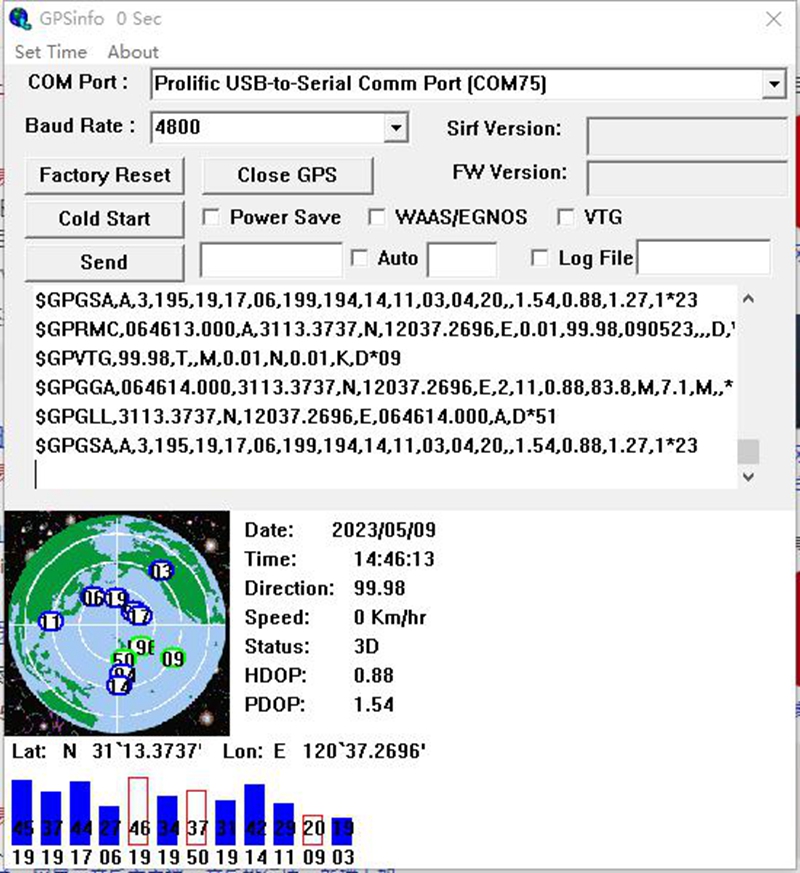 - Before testing, install the driver PL2303 and GPS testing software "GPS Information". The driver and testing software can be downloaded from the official website for GlobalSat at www.globalsat.com