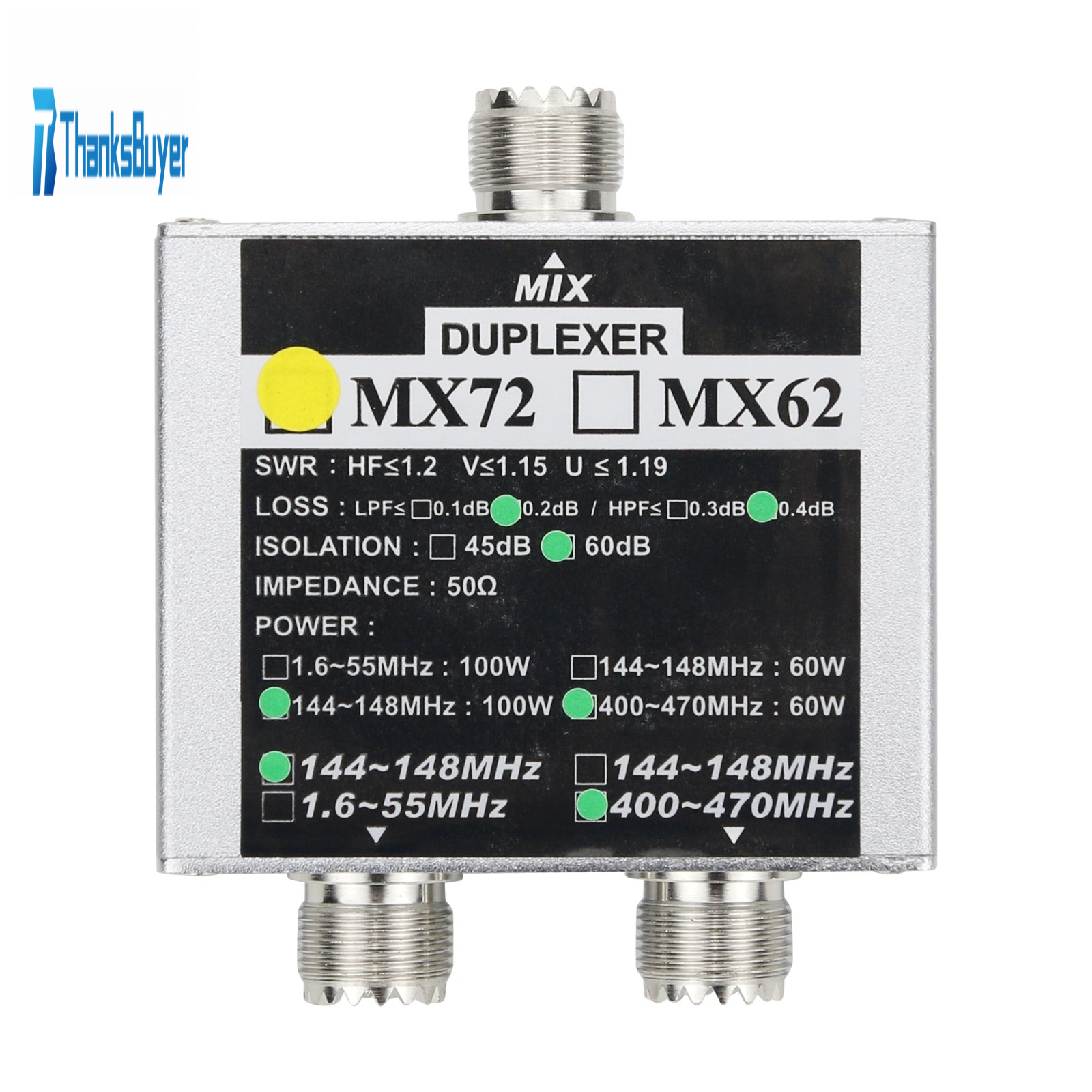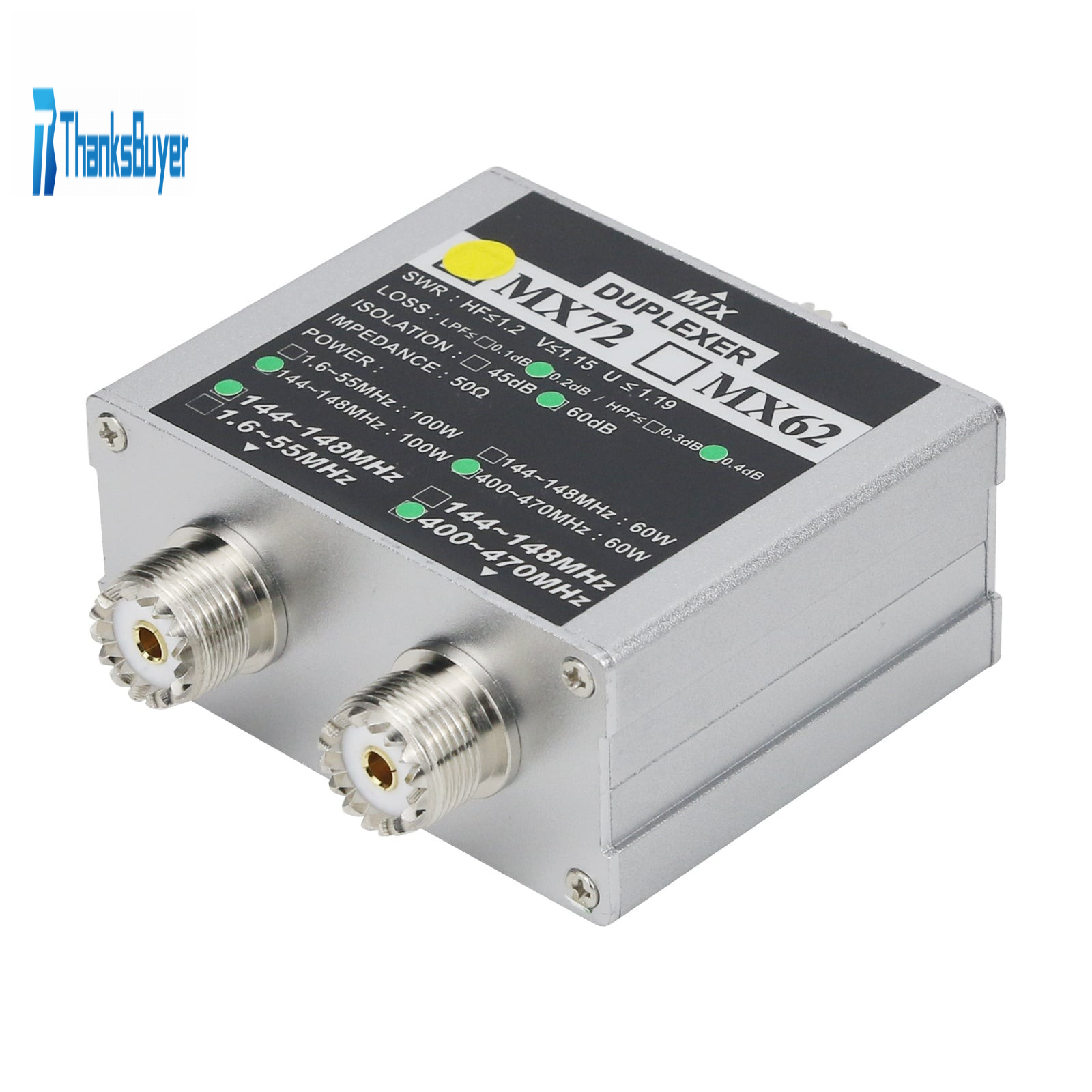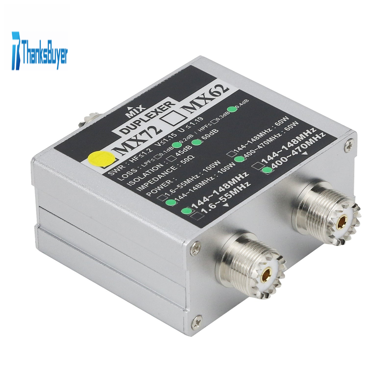 - Insertion loss: 144~148MHz: ≤0.2dB; 400~470MHz: ≤0.4dB