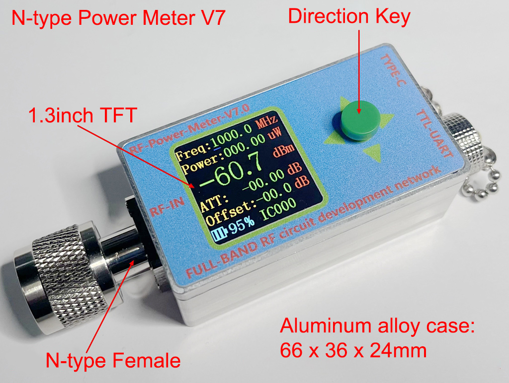 - RF-Power-Meter-V7.0 series is a high-performance low-cost portable TYPE-C simple RF power meter with simple instruction, small size, stable performance, high accuracy, preset offset, wide dynamic range and fast measurement speed. 5V power supply and high-speed data communication are provided through TYPE-C. The software matched with this power meter enables users to configure the power meter on the PC and makes it easy to record and share data.