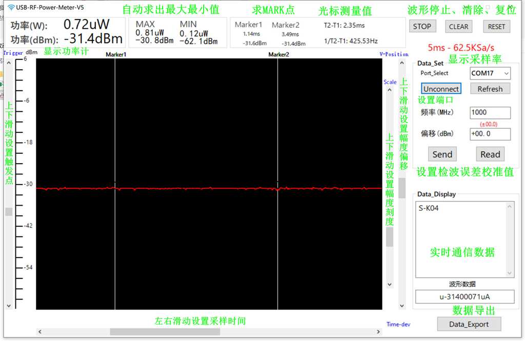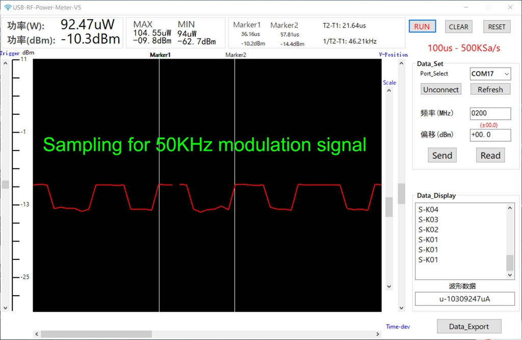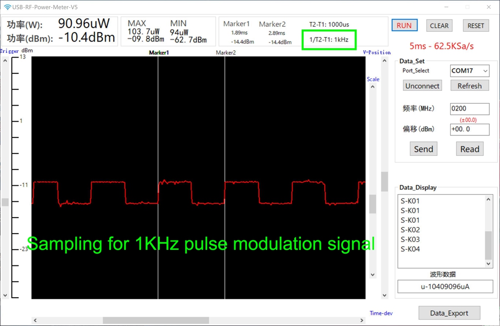- The upper computer has two MARK cursor functions to measure the modulation pulse width; Automatic calculation of maximum and minimum values; The maximum storage depth is 500 points; Support pause, data saving and export functions.