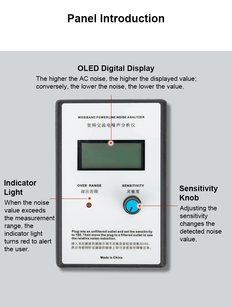 * OLED Digital Display: The higher the AC noise, the higher the displayed value; conversely, the lower the noise, the lower the value.
