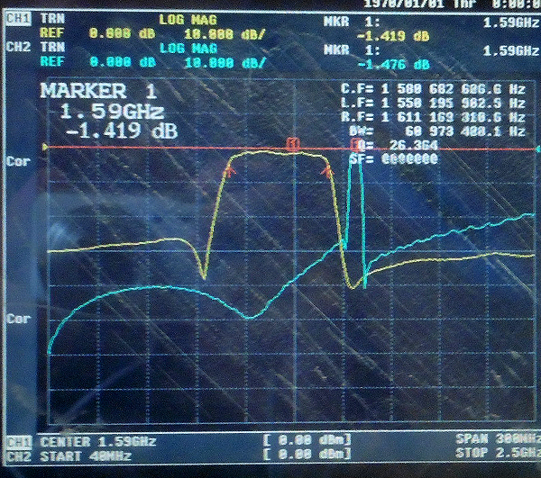 The blue line span is 40-2500MHz; the center frequency of the yellow line scan is 1590MHz, and the span is 300MHz.