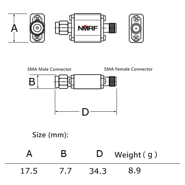 - Interface: SMA male connector, SMA female connector (RF characteristics have no directionality and can be input/output at both ends)