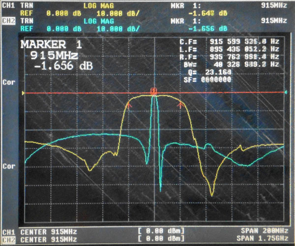 The yellow line in the figure has a span of 200MHz, the blue line has a span of 1750MHz, the marked points are 3dB bandwidth, and the vertical scale is 10dB per division.