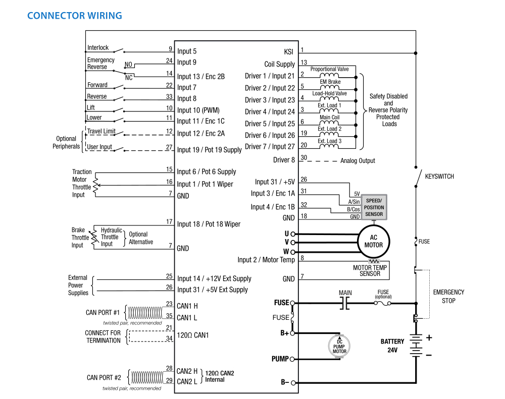 AC F2-C is an integrated AC Traction & DC Pump System Controller. The AC F2-C motor controller, combined with a Half-bridge DC hydraulic pump and proportional valve control system, uses dual high performance microprocessors for ARM Cortex in a compact package. The AC F2-C controller delivers unmatched performance and a very flexible feature set.