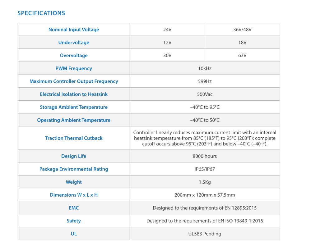AC F2-C is fully optimized for use as a Combi traction and hydraulic controller on 1.0 ton-2.0 ton class III pedestrian-operated powered pallet and stacker trucks. It provides vehicle designers with the ability to fully define and control the detailed dynamic performance of their vehicle’s drive-train and hydraulic pump system, and also provides comprehensive vehicle management and CAN capabilities. Model AC F2-C is also suitable for traction and hydraulic pump control on other types of battery powered vehicles such as the small aerial scissor lift platforms. Together with 3141 CAN LCD display and the user-friendly Integrated Toolkit for Curtis, the AC F2-C is the ultimate Class III truck control system.