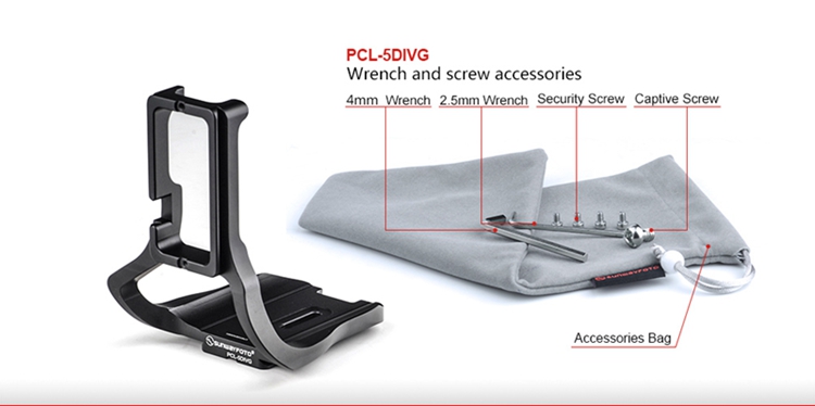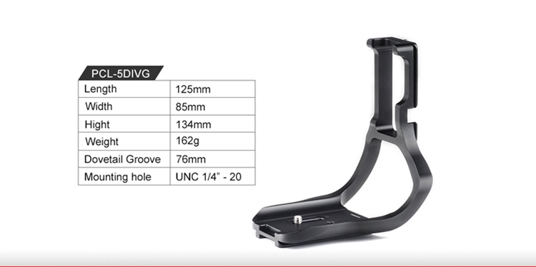 PCL-5DIVG custom L bracket for Canon 5DIV body with battery grip, adopt CNC cutting machined from light weight aircraft-grade aluminum, stain anodized surface finish for better abrasion and corrosion resistant. (Battery is not included.)